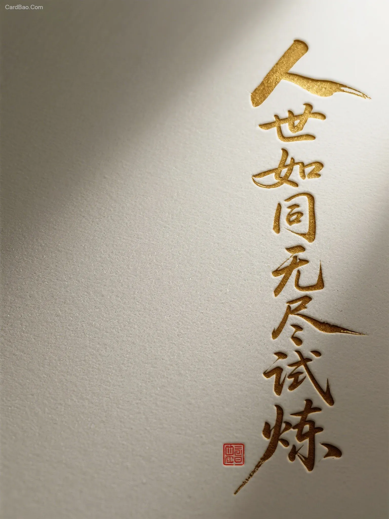 书法海报创意作品,纯色哑光细颗粒质感背景,图片右侧竖着飞舞手写烫金色小字“人世如同无尽试炼”,玻璃雕刻腐蚀效果,内凹陷风格,深度压痕效果,字体浑厚有力手写体,书法家作品,文字右下方有个极小的正方形红色文印