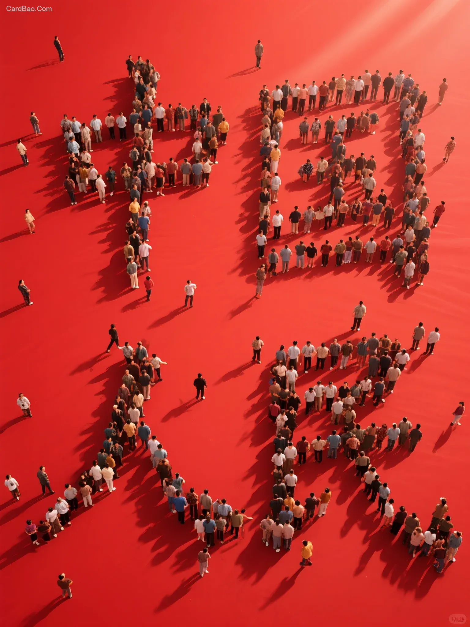 鸟瞰图,巨大的文字“中国人民”由几千个人站在一起拼接成笔画,真实的拍摄的人,他们紧紧站在一起。明亮的纯红色背景,数字的简约轮廓,具有个人姿势的超详细人群纹理。光源来自右上方,文字投下阴影,真实影响,电影级品质。正面视图。文字外不要有那么多人。