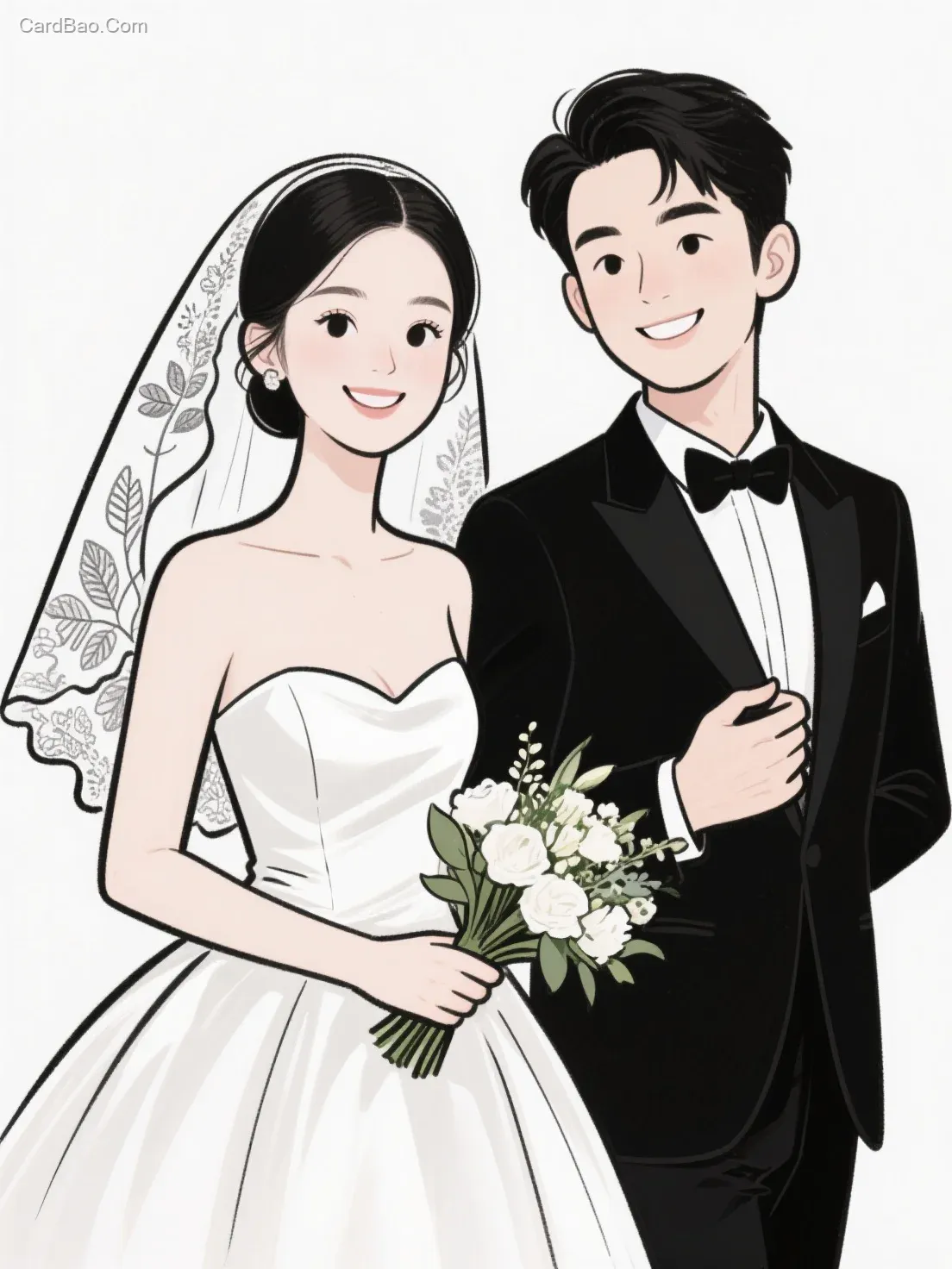 一对手绘风格的新郎新娘,新郎身着黑色的西装,新郎一手扶西装衣襟。新娘穿白色抹胸缎面蓬蓬裙婚纱,婚纱胸口平的。新娘手拿捧花,新娘头发中分精致低盘发,头纱大树叶花纹蕾丝,盖住一侧肩膀。风格极简高级,富有手绘质感,粗线条简笔画变形,简笔画五官。纯白色背景,细节精致,动作时尚,快乐氛围,浪漫甜蜜,全身构图看向镜头。