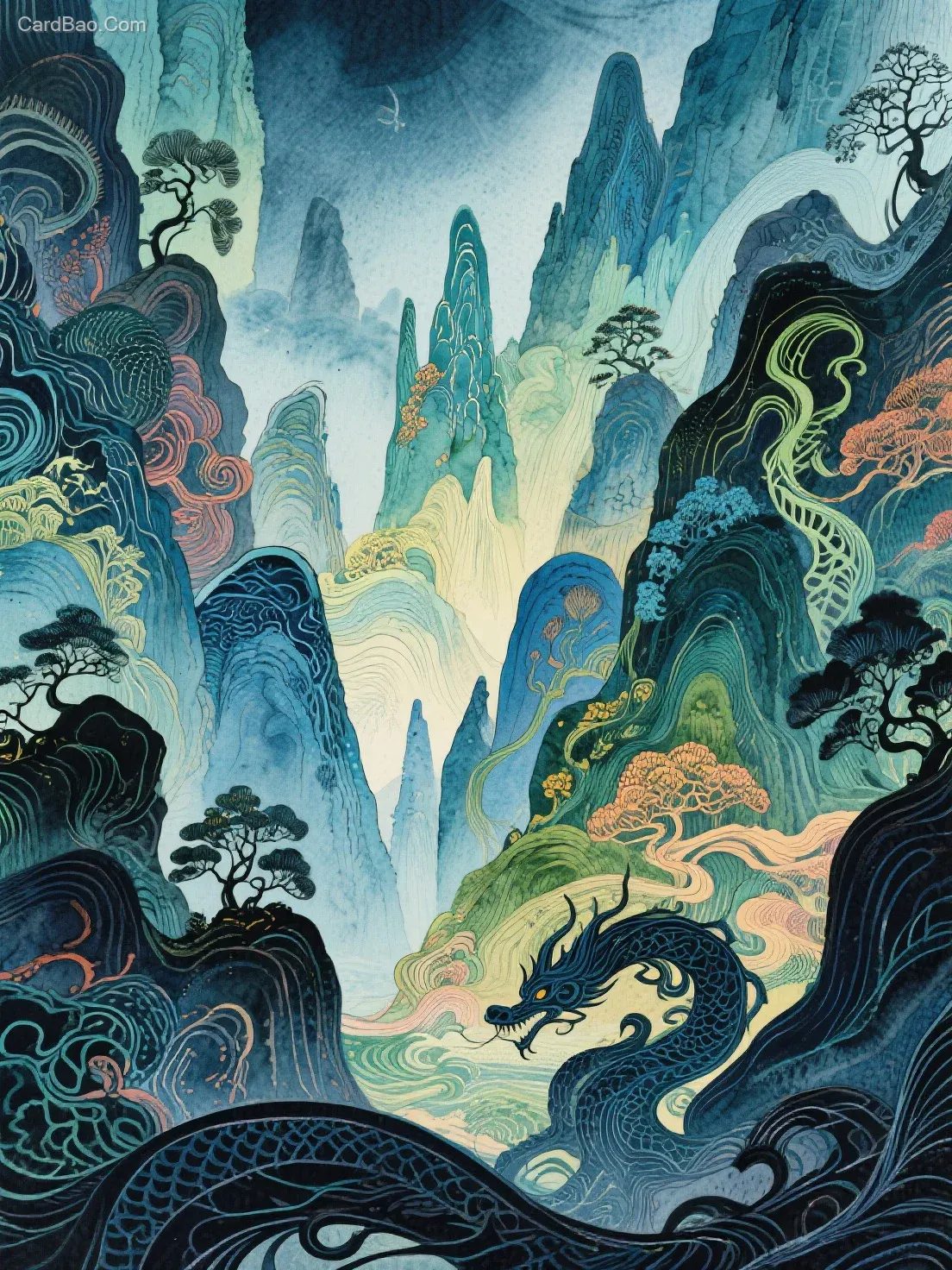 线条水彩混成,雷蒙德与马蒂亚斯风格,神秘元素,创意背景,山海经奇景