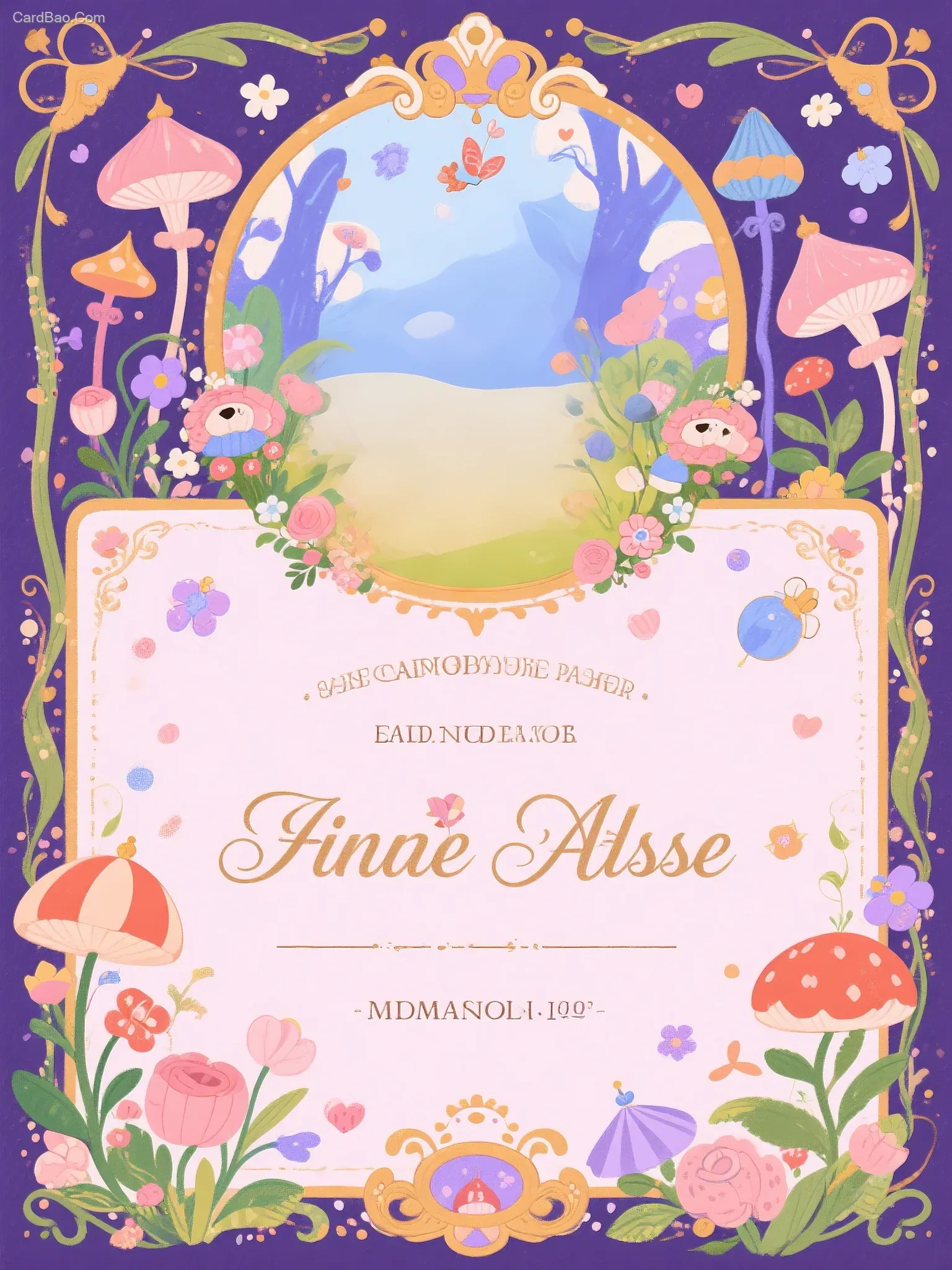 做一张爱丽丝梦游仙境主题的婚礼请柬插画设计,画风卡通浪漫主义,华丽