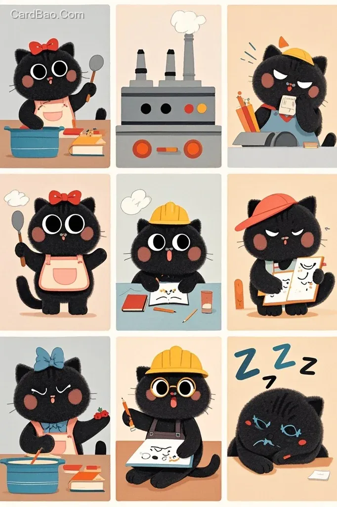 3x3网格图,毛绒绒可爱卡通,一只可爱的黑猫,表情符号,各种表情,生气,高兴,郁闷,发愁,不同的情绪,不同的姿势,工作中,吃饭,上课,上班,睡觉,学习,生活小场景,极简主义,手绘插图风格, 浅色主色