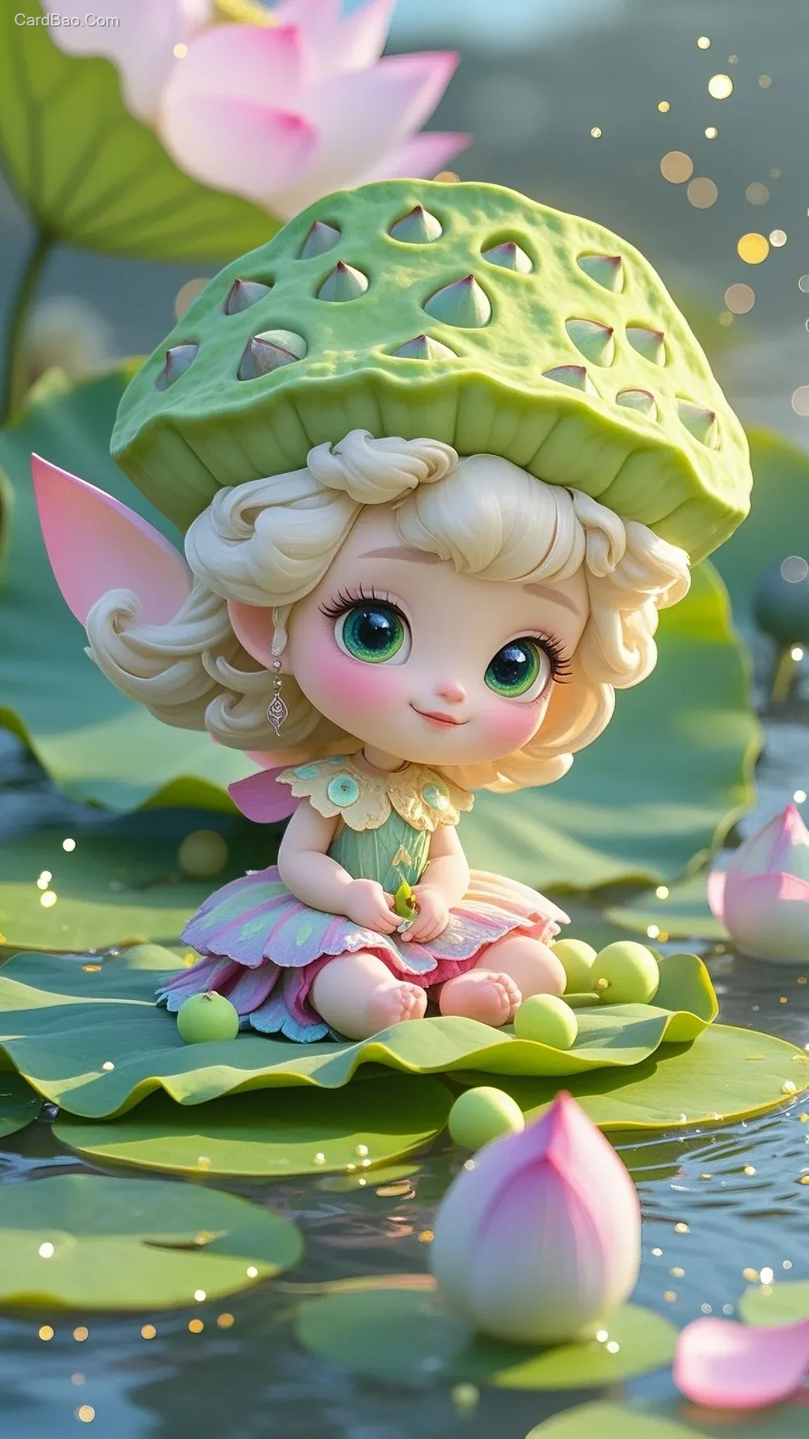 特写聚焦莲蓬精灵,大眼睛明亮而深邃,睫毛根根分明,粉嫩的脸颊细腻逼真,仿佛能感受到那细腻的肌肤质感。莲蓬壳拼接的小裙子纹理清晰,每一片的色泽和形状都栩栩如生,莲子饱满圆润,光泽自然。头戴的莲蓬帽子细节满满,莲蓬的脉络、莲子的排列都分毫毕现。阳光洒下,在水面和荷叶上形成斑驳的光影,画面高清,洋溢着奇幻清新的童话色彩,将莲蓬精灵的独特魅力展现得淋漓尽致。