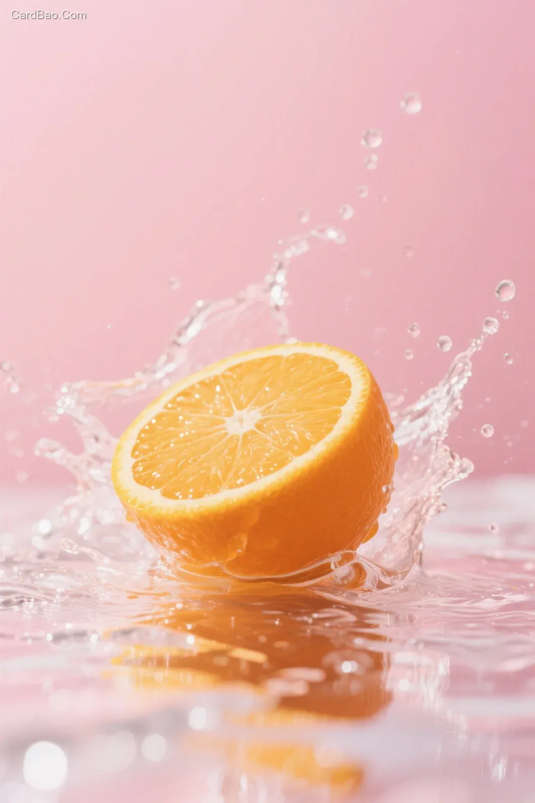 橙子与水的照片,淡粉色背景,色彩绚丽,纹理细腻,饱和度高,采用微距摄影风格,有水花飞溅效果,静物特写,充满清新感。