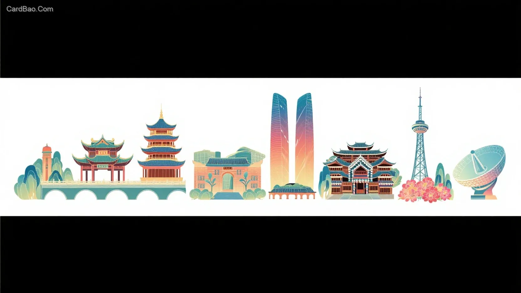 Illustration of Guizhou city landmarks, with all elements aligned in a single row, staggered in depth to appear as a cohesive whole. Include Jiaxiu Tower, Wenchang Pavilion, Zhucheng Square, Qianhu Miao Village, Guiyang Huaguoyuan Twin Towers, Guizhou TV Tower, and China's Five-hundred-meter Aperture Spherical Radio Telescope (FAST). The style should be Chinese-chic artistic hand-drawn vector, featuring gradient colors on a white background. No text should appear in the image, all elements must stay within the canvas, and the arrangement should not extend to two rows.