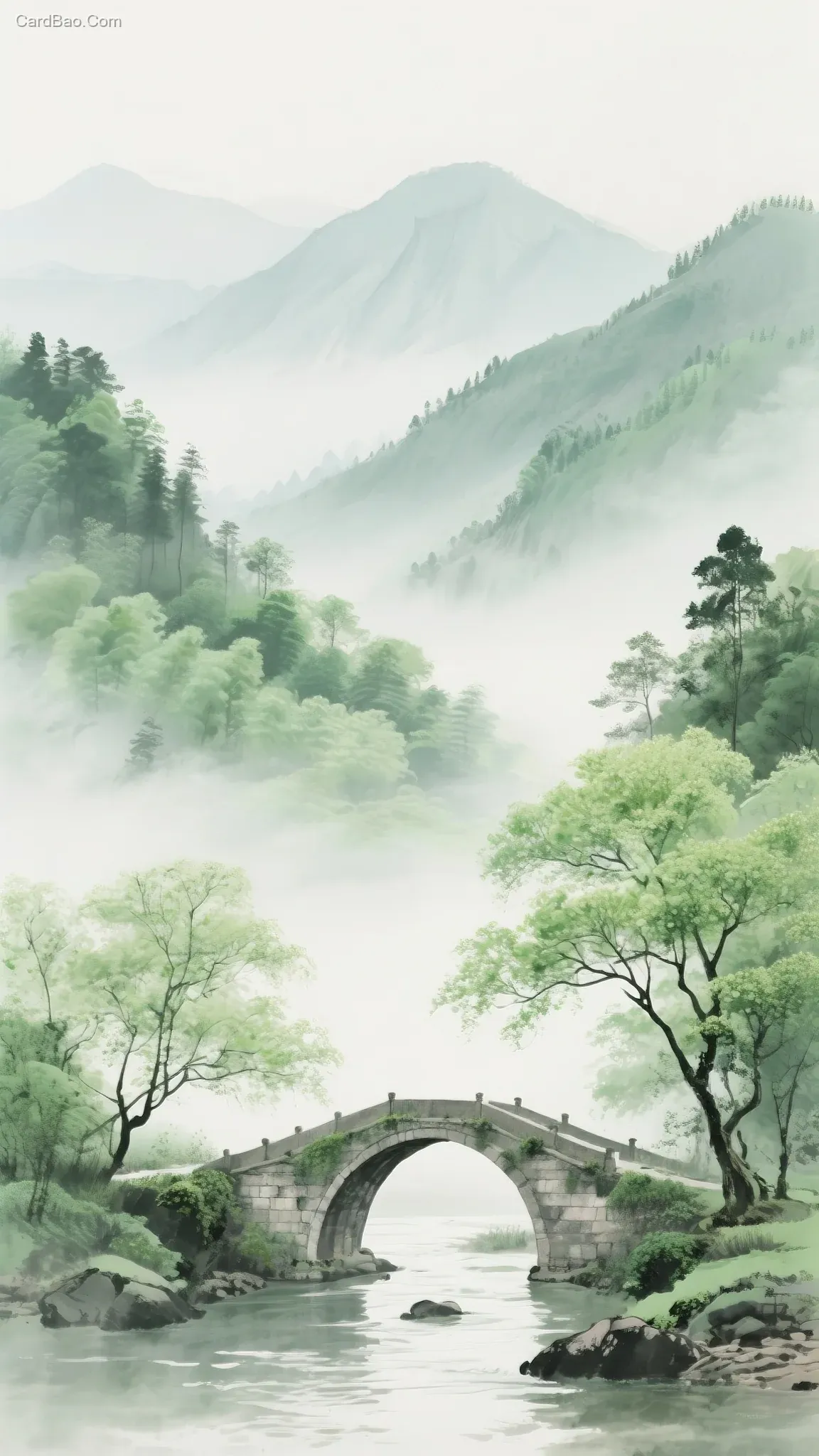 In the spring of Jiangnan, a stone arch bridge spans a small stream, resembling an elegant and fresh ink wash painting, so beautiful it seems like a dream. The mountains of Jiangnan roll gently with soft contours. In spring, the mountains are lush with vegetation, and the newly green trees are dense and vibrant. The varying shades of green intertwine, much like the layered brushstrokes in an ink wash painting, showcasing a rich sense of depth. Mist drifts through the mountains like a delicate veil, adding a touch of ethereal beauty to the peaks, reminiscent of the intentional blank spaces in ink wash paintings that leave room for endless imagination. High definition, natural theme, spring, cinematic quality, soft glow.