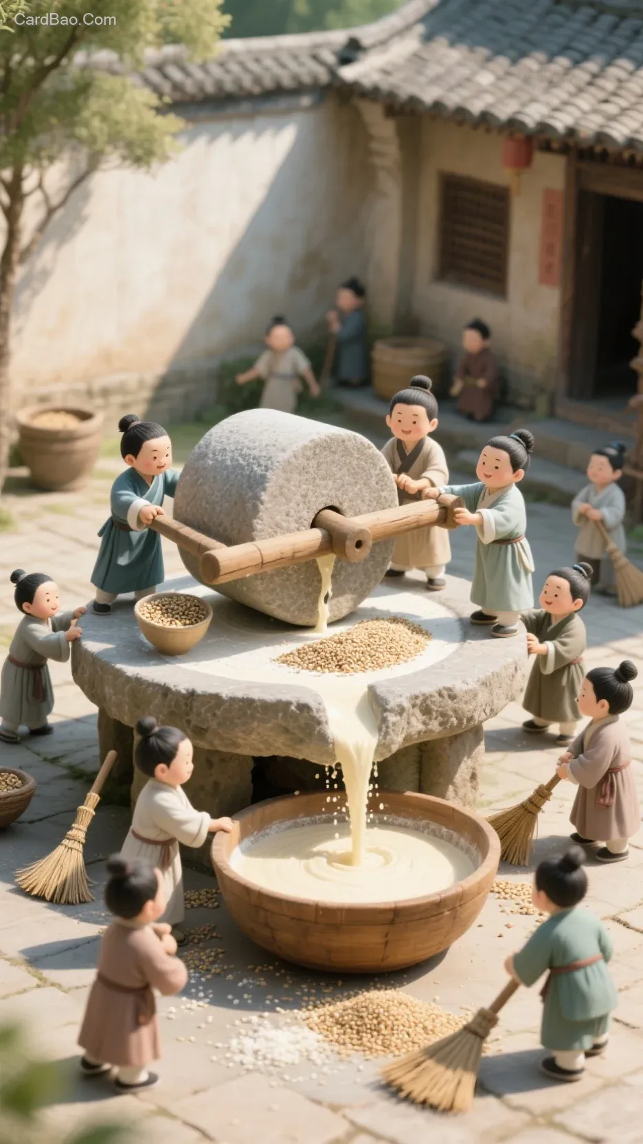 - Image generation prompt: In a corner of the courtyard, a large stone mill is set up. Over a dozen small figures dressed in Hanfu are working together to grind the batter. Two of them are strenuously pushing the handle of the mill, causing it to rotate slowly. Two others stand beside the mill, pouring mixed grains and water into the mill's eye. The remaining figures are either helping to sort the grains nearby or using small brooms to clean up the residue scattered around the mill. Below the mill, a smooth, fine batter slowly flows out and collects in a large wooden basin. Sunlight spills over them, highlighting their focused and earnest expressions, creating a bustling and joyful atmosphere.