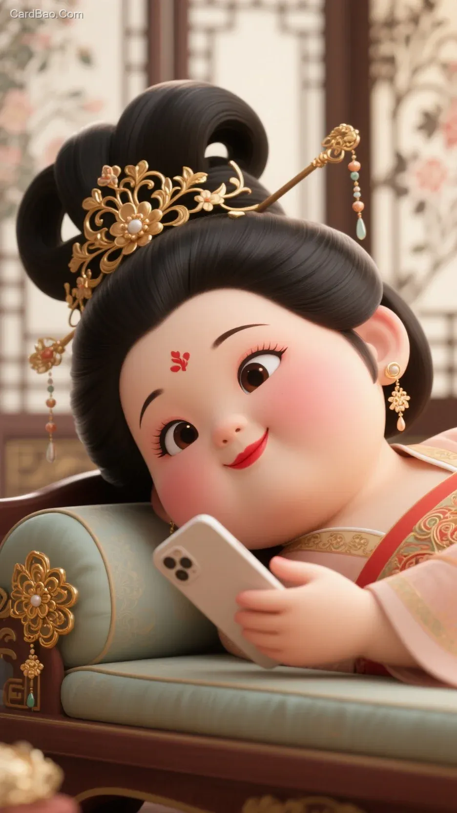 3D渲染风格,超现实主义,一个胖嘟嘟很可爱的古代女子,五官精致,大眼睛双眼皮,眉型为细长的柳叶眉,眉色自然,双眸明亮有神,呈杏仁状,透着温婉灵动之感,鼻梁小巧精致,恰到好处地勾勒出面部立体感,唇形饱满。途有鲜红的口脂,嘴角微微上扬,似带着一抹浅笑,流露出亲和气质。她的头发乌黑亮丽,梳成了经典的唐代倭堕髻,倭堕髻插鎏金蔓草纹头饰,发髻高耸且富有层次感,线条优美流畅,戴着精美的头饰,发簪造型繁复,雕琢着精致的花卉或藤蔓纹样,末端垂有小巧的坠饰,随着人物动作微微晃动,另一侧装饰有华丽的金质花钿头饰,增添了几分雍容华贵。卡通