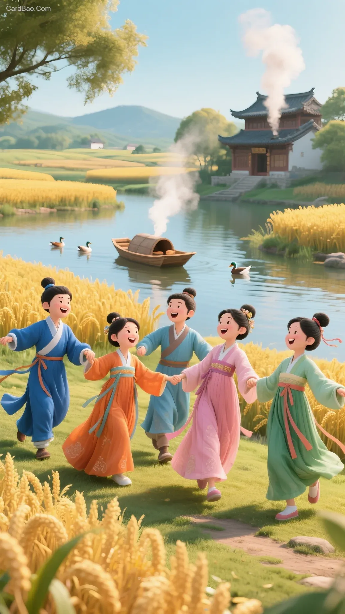 六位身着多彩传统汉服的人物在田园河边手拉手起舞,服饰有蓝、橙等色,发型为传统发髻,面带笑容。背景有河流、游鸭、冒炊烟小船及传统建筑,周围是金黄色农作物,,3D渲染,卡通风格