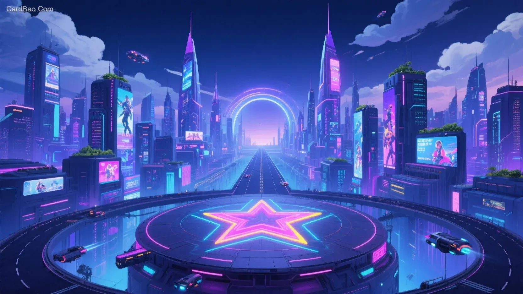 图像中心是一个巨大的圆形平台,平台上有一个巨大的五角星,五角星散发着五彩斑斓的光芒,主要以粉色、蓝色和黄色为主,显得格外耀眼。平台周围是环形道路,道路上有一些飞行载具在行驶,增加了画面的动态感。