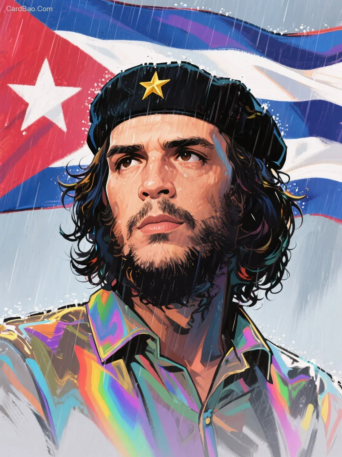 The iconic portrait of Cuban revolutionary Che Guevara, wearing a beret adorned with a golden five-pointed star, with a partial backdrop of the Cuban flag. The artwork conveys intense emotion, filled with profound feeling and power. Rendered in an anime style with highly intricate details, featuring reflective iridescent colors, translucent rainbow-like hair, and thick acrylic-inspired illustration. Best quality, character-style rendering, rain-themed illustration, 8K resolution, HD, soft lighting, and optimal artistic quality.
