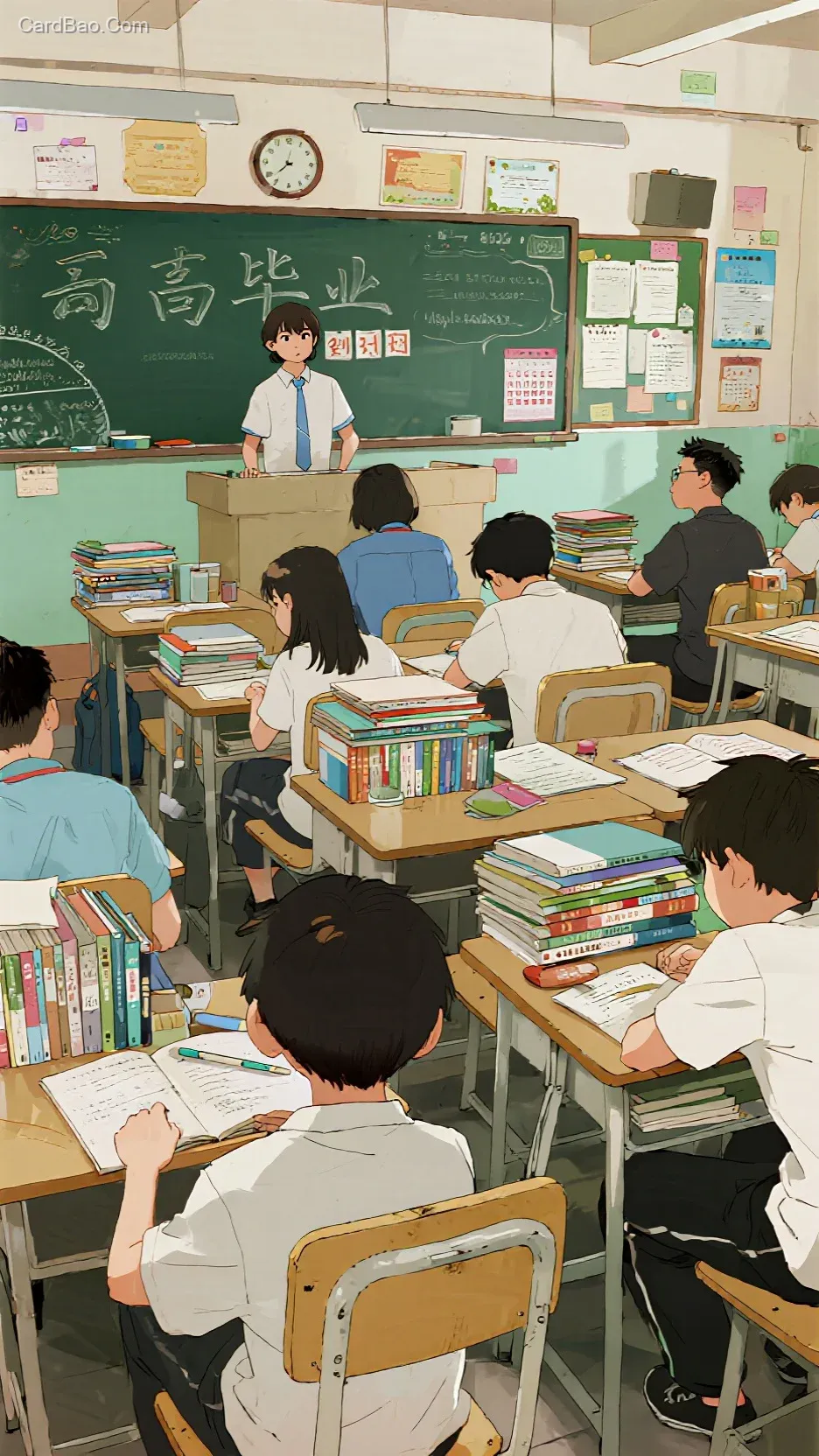 Moebius (Jean Giraud) style, maximalism, a Chinese senior high school graduation classroom. All students are facing the blackboard, with stacks of 20-30 books piled on each desk.