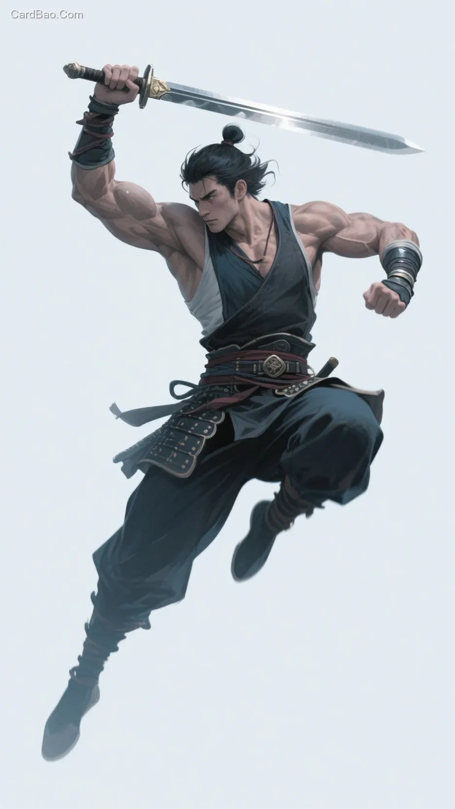 Western warrior, with a strong and muscular physique, wearing a vest, close-up shot, blank background, holding a sword, leaping into the air in a combat pose, exuding a majestic and powerful stance.