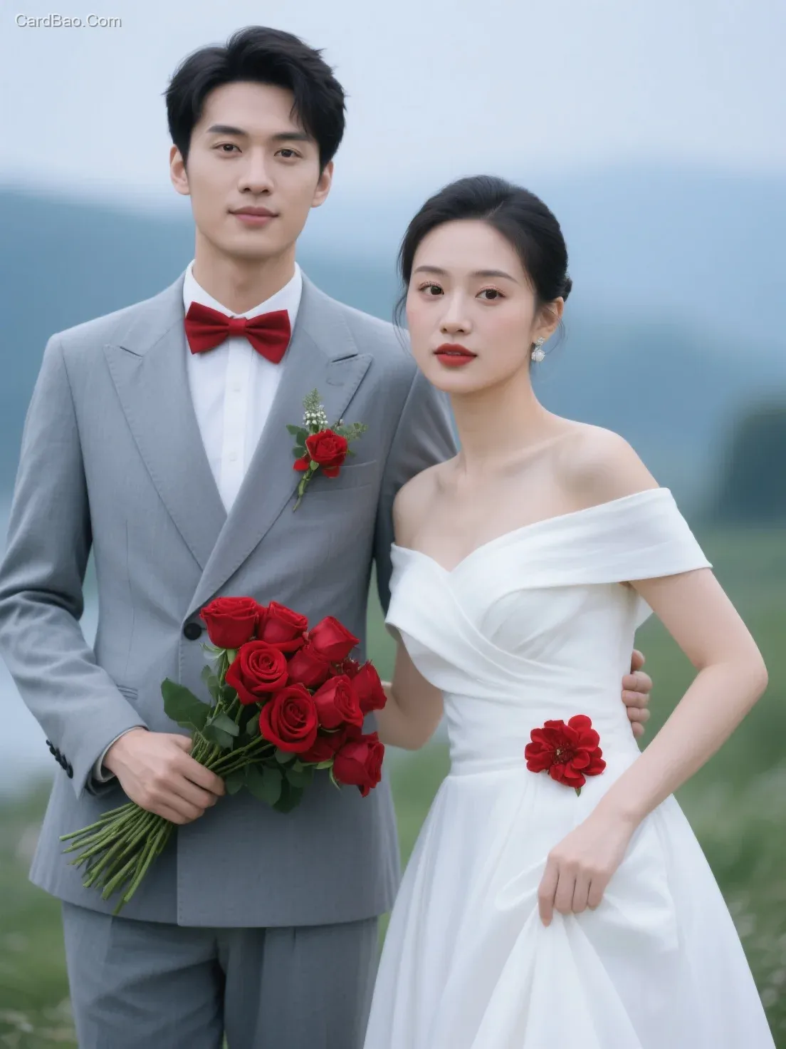一对情侣站在户外,男士身着银深灰色西装,搭配红色领结,胸口别着胸花,手中捧着一束红色玫瑰花束。女士穿着一袭白色露肩婚纱裙,肩部有红色花朵装饰,妆容精致,姿态优雅,右手轻搭在男士手臂上,全身正脸照,大师作品,超高清