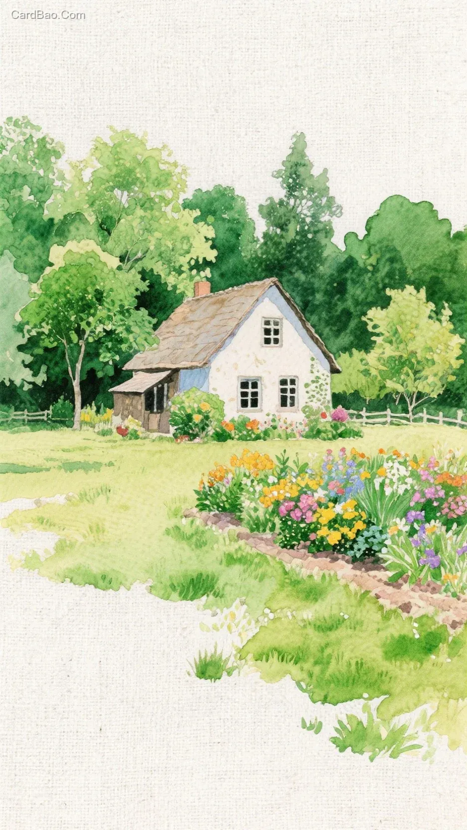 Vibrant watercolor inks bleed into white coarse linen, forming a rustic scene with prominent linen textures—a small country cottage nestled among green trees. In front of the house lies an elegant little garden, brimming with blooming flowers.