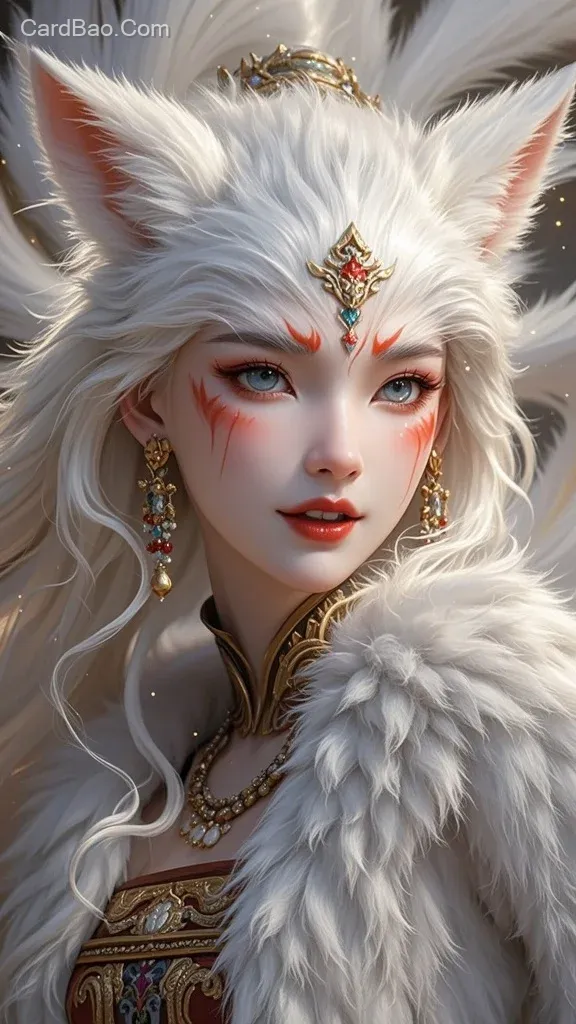 CG特效,山海经,九尾狐妲己,妖媚诱人面孔,表情柔和,白色九尾蓬松,毛绒细腻,光感,故事性,疯狂的细节,超现实主义,半身照,8K,高质量