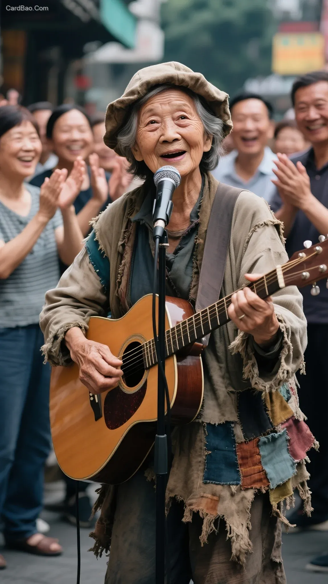 A woman in her 70s with good facial features, a clear and bright complexion, large eyes, and lively facial expressions. She is shown in full body, playing the guitar and singing into a standing microphone. She is dressed in ragged, patchwork beggar's clothing and wearing a beggar's hat. A group of adults in Guangzhou are applauding for her.