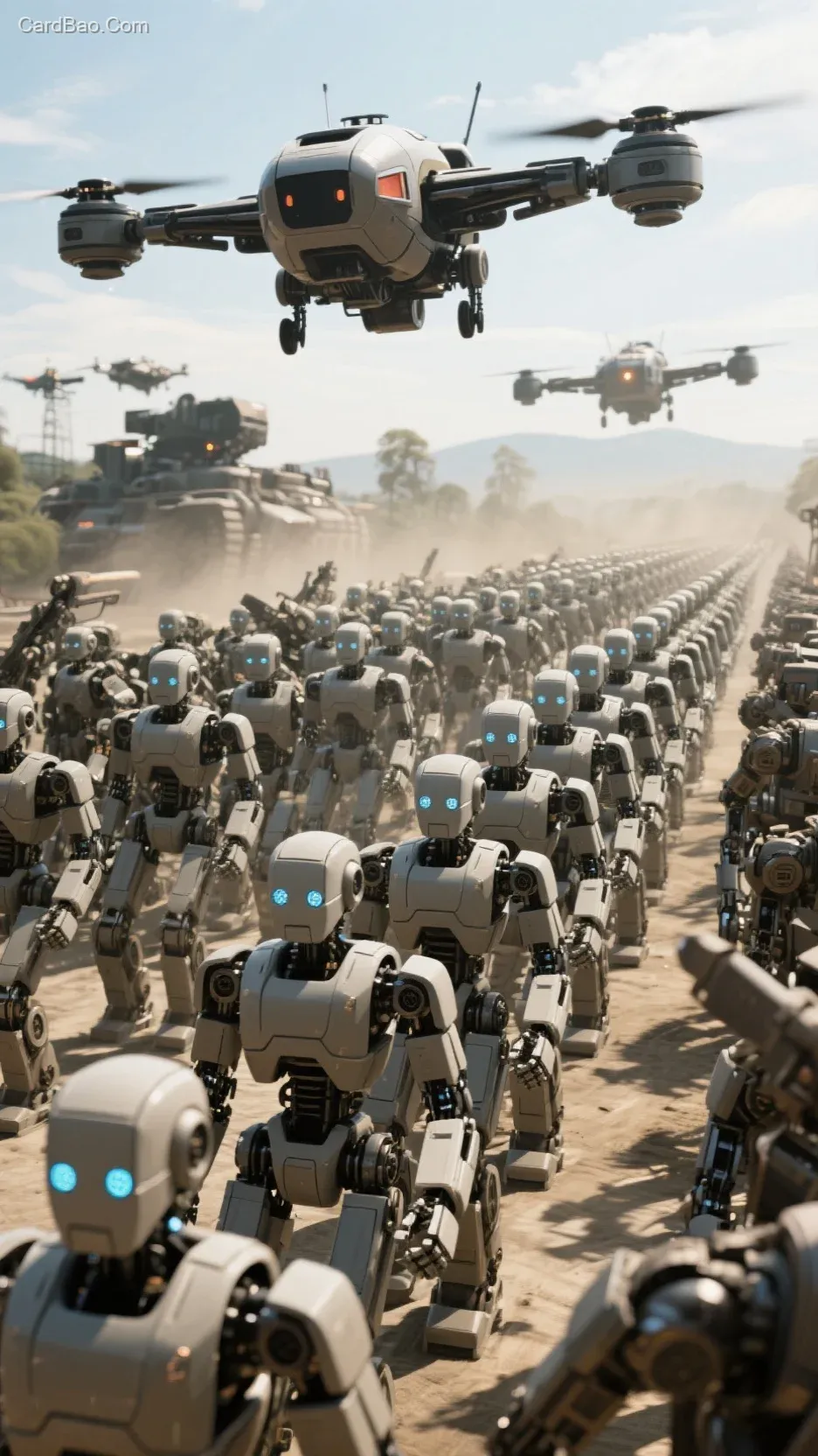 The mighty robot army marches proudly and spiritedly toward the front lines. Some are flying in the sky, while others advance in rows and columns—truly a spectacular sight.