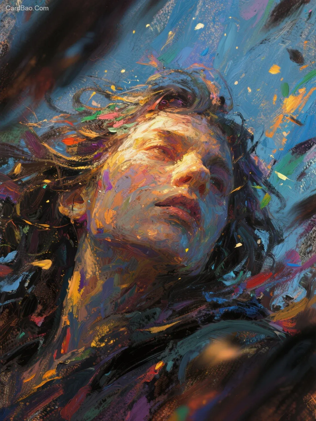 Using OC rendering to produce an 8K ultra-high-definition image with a coarse-grained texture, employing techniques such as palette knife strokes, impasto, and thickly applied brushstrokes to build up layers of paint. Warm and cool colors intertwine to create a highly saturated oil painting texture. The brushstrokes are delicate, the colors are rich, with color blending and textural effects. Dappled light and shadow, under Rembrandt lighting and backlighting, create dramatic lighting effects. Shot from a low-angle perspective with dynamic angles, paired with a 12mm ultra-wide-angle lens and combined with telephoto large-aperture bokeh, the image presents an overall blurred effect with soft edges. Dynamic motion blur trails, motion blur effects are prominent, along with dynamic hair static stardust, smearing, out-of-focus elements, light leaks, high contrast, and film grain. The overall effect is filled with wild, chaotic emotion and expressive release, with diffused particles blending throughout.