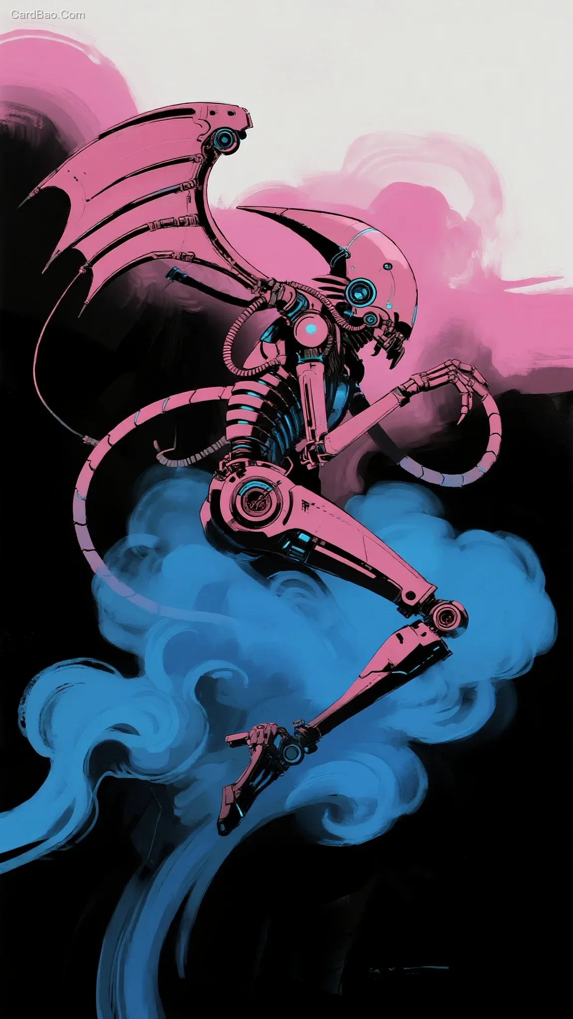 极简黑色画布,靛蓝烟雾丝滑弥散粉红色未来主义科幻机械生物形象,夸张线描动作巧妙悬浮,生物机械质感,先锋艺术混搭蒸汽朋克元素,科幻,神秘