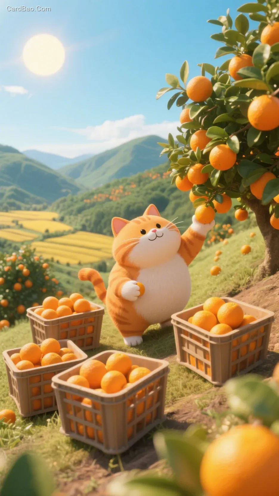 摄影风格,一只拟人化胖橘猫,(在山坡摘脐橙,身边的三个大框子都已经装满了,现在第四个也快装满了,它还在把一个个脐橙从脐橙树上摘下来。整个山坡都是等着摘的脐橙。蔚蓝的天空上,太阳很温暖,远处是绿色的大山和金闪闪的田野。)卡通风格有景深,有环境光。