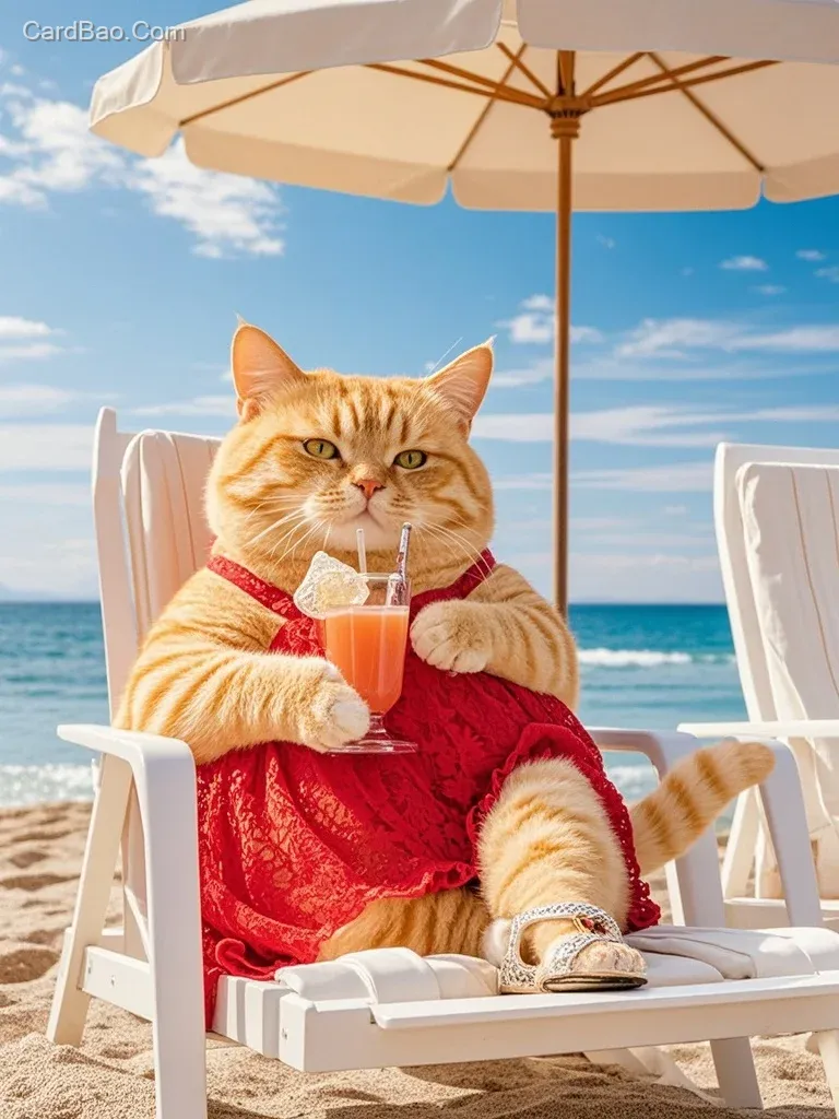 动物摄影,拟人化的胖橘猫,全身照,穿着红色连身蕾丝吊带裙,穿着高跟鞋,坐在海滩边的座位上喝果汁,遮阳伞,风景美丽,时尚杂志封面摄影效果,50毫米镜头拍摄。