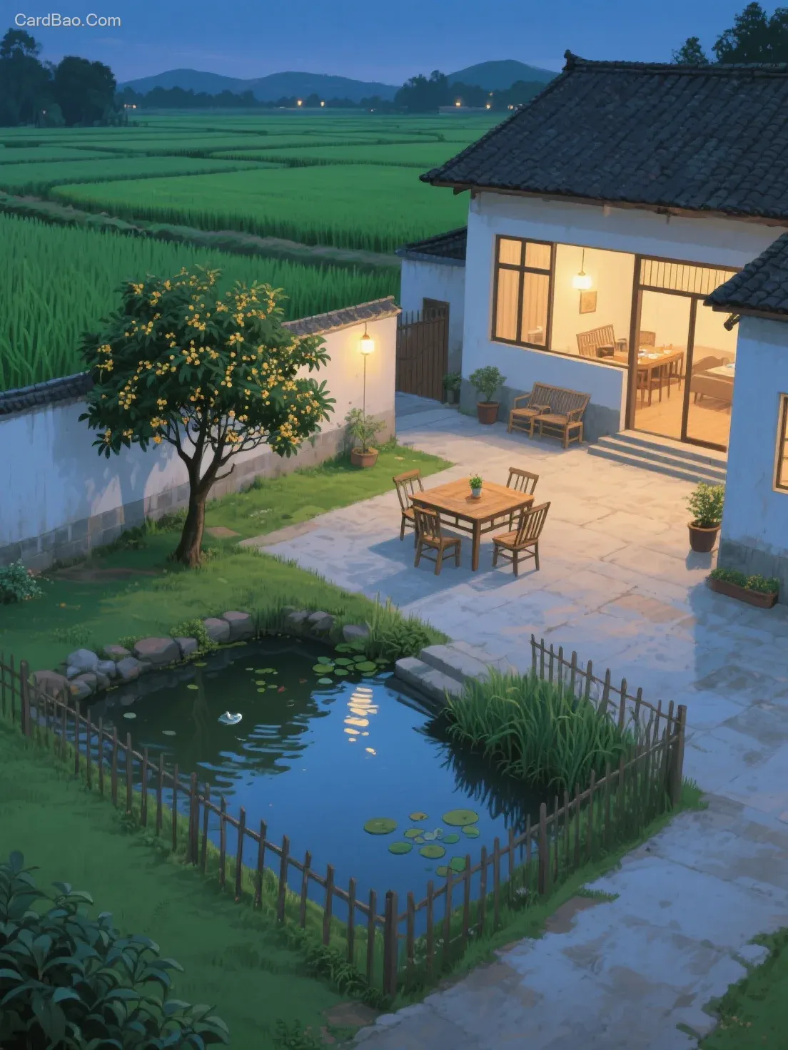 真实场景,现代农家大院,偏院,围墙,有颗桂花树,小溪,鱼塘周围围了一圈栅栏,院子外是碧绿的稻田,屋内开着灯,能看到屋里的家具,小院子放着桌子,夜晚,画面细致,场景温馨,写实插画风格,广角镜头