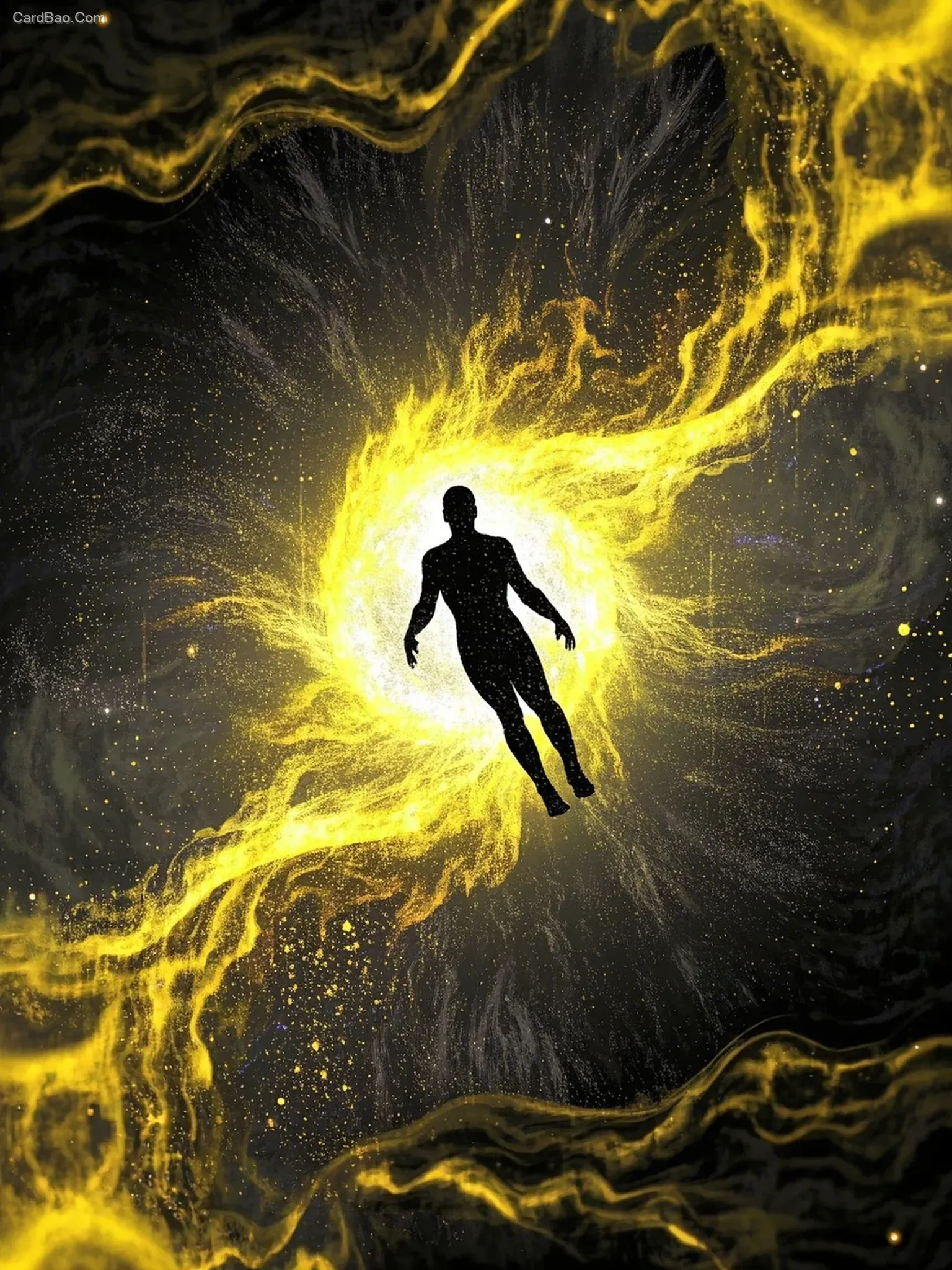 超现实主义风格,,高饱和黄黑渐变色,中心对称式构图,失重漂浮 坠落状态,流体力学光斑,星云粒子折射光,生物气溶胶质感,拓扑形态重组,意识可视化表达,空间压缩透视,动态凝固悖论,微尘光学衍射层,肌理噪点叠加技法,暗黑戏剧性背景,能量场聚焦光晕,物质量子化分解,负空间呼吸韵律,非牛顿流体动态,黄金分割比例,超现实漂浮悖论,神秘主义氛围,能量场聚焦光晕+流体力学光斑+暗物质漩涡纹理,混沌,光粒子,悬浮的金色光粒子组成,令人惊叹的光效,在虚空之境,深色背景,宏大叙事,震撼画面,奇幻色彩,仰视角度,3D,虚拟引擎,辉光,动态摄影,强烈明暗对比,仰视角度,融合 2D 插画手绘与 3D 渲染,呈现超现实主义,怪诞可爱的黑暗童话风。奇特视角怪诞梦幻感,它用点线面画法,漫画形式,以极简主义为主调,采用低饱和度的柔和暗色调,比如浅黄色与黑色搭配,色彩弥散发光。画面中有一个人形状的圆润感剪影特写,充满梦境感。磨砂的朦胧质感,和模糊的光,风格大胆前卫,极具超现实主义的夸张、奇异与迷幻光彩。运用极简主义,通过留白营造出高级意境。具备极高分辨率,充满创意与冲击力,用留白增加想象力,科技感的抽象未来世界,萌矢量艺术插画,复古未来主义,超现实主义梦境景观,高饱和度高纯度高级色彩搭配,颗粒感质感材质,使用Blender的Cycles渲染器,孤独,梦中的场景 梦境,噩梦,坠落 恐惧 高清晰度,超清画质 ,没有逻辑 ,旁观者 解构艺术,荣格梦的解析,梦中的意象,极简主义风格,