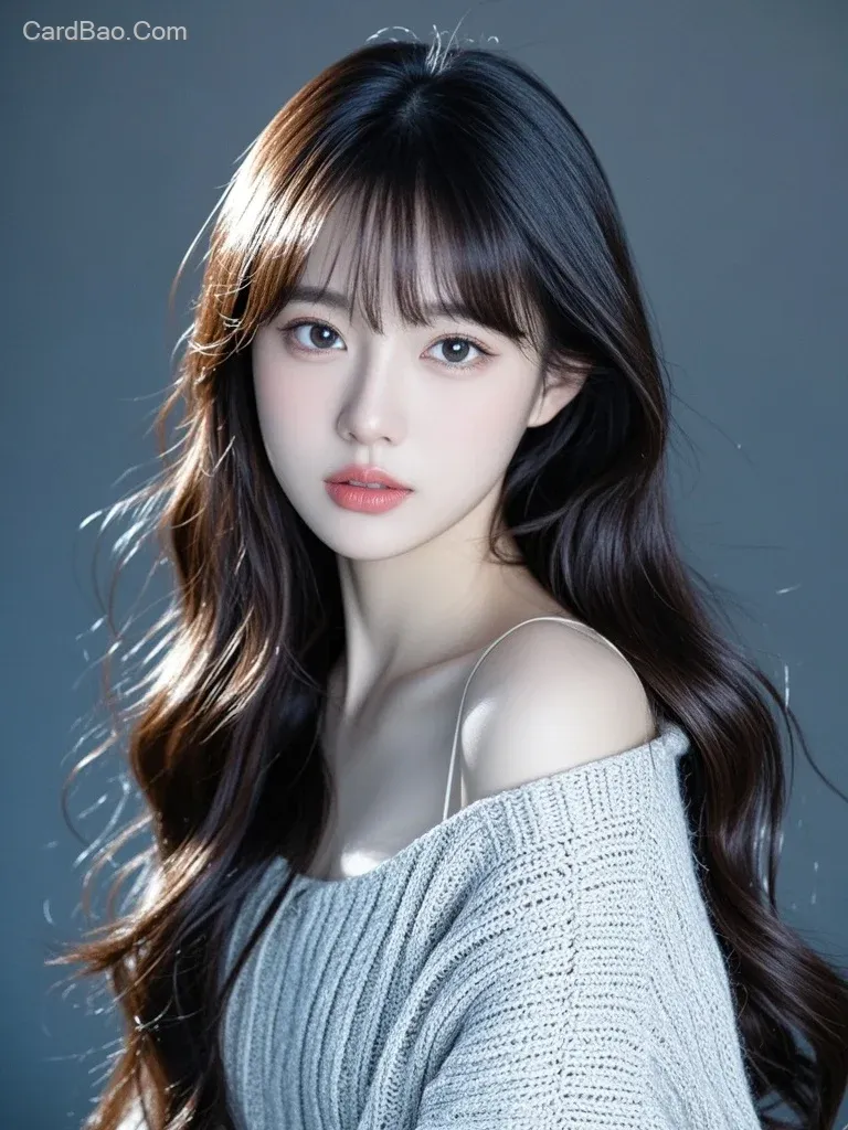 时尚优雅,甜美可爱脸,长发飘飘齐刘海的美女,背景深灰色,写实,真实照片,高清,蓝光,4K画质,光影,浅色路肩针织衫