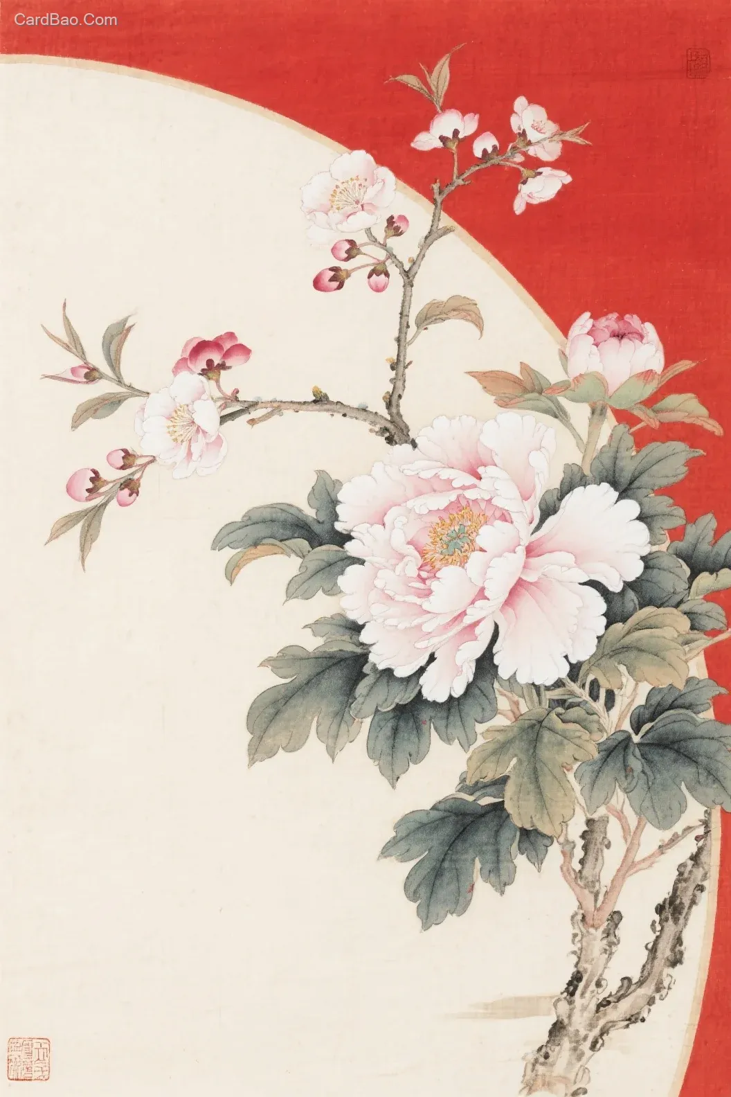 Chinese-style meticulous painting of blooming peonies and crabapple flowers with a traditional red background