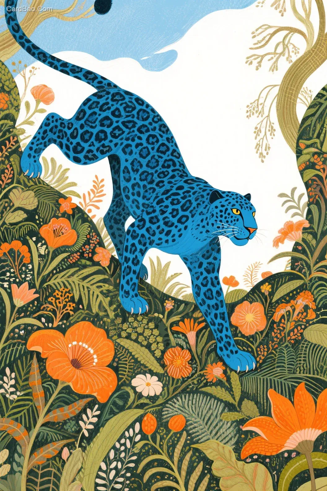爱马仕插画大师杰作,极繁主义,复古插画,时尚插画,Karlotta Freier的风格,爱马仕插画,丛林中矫健的克莱因蓝色美洲豹,特写,白色的天空,爱马仕橙色的丛林,盛开的奇花异草。梦幻般的风格,独特的视角,细腻的笔触,创新的撞色技法。治愈系插画,高品质细节,高分辨率,最佳品质,8K壁纸,