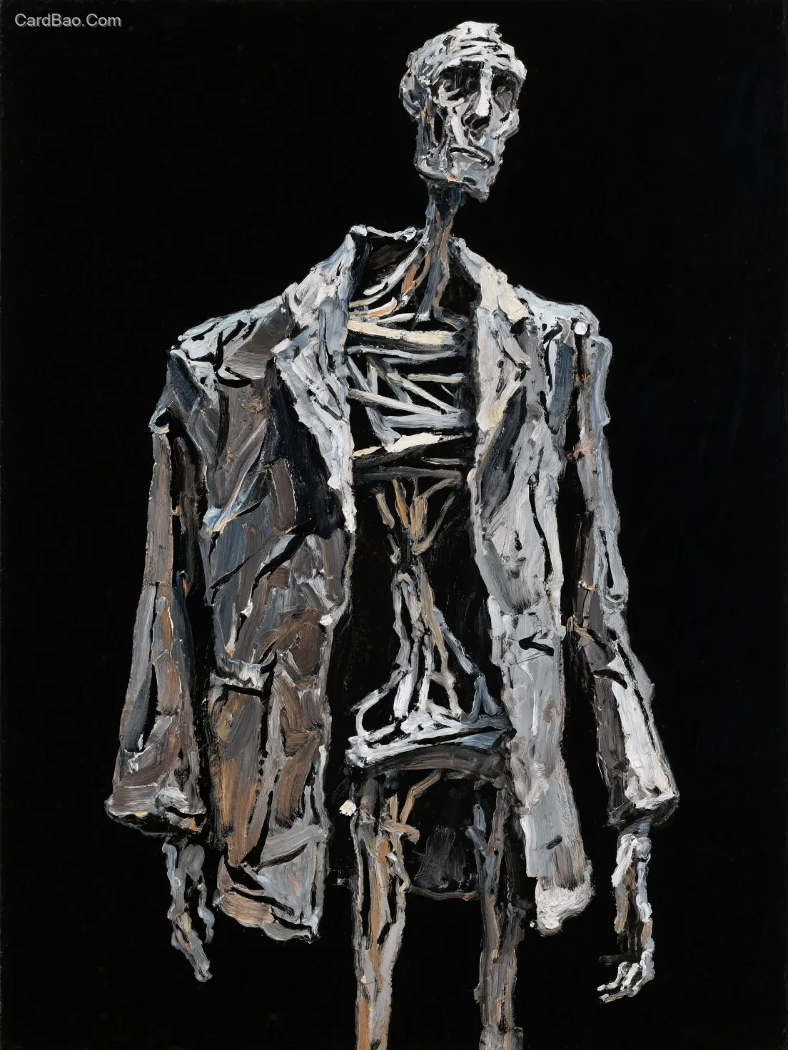 贾科梅蒂拉长雕塑,铅制人偶,衣帽纹理用画笔描绘表现主义线条,黑色背景,思想表达