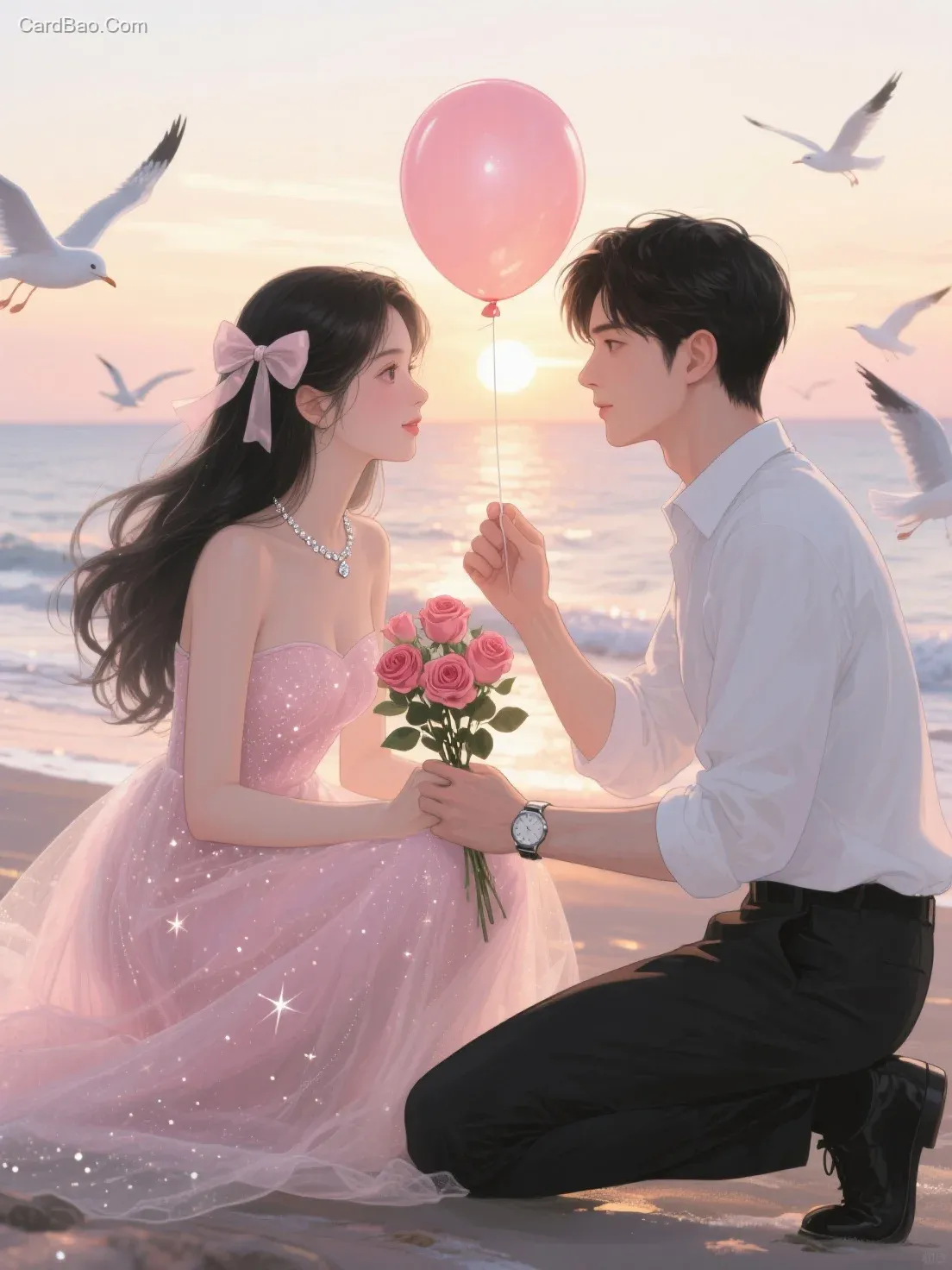 Hand-drawn illustration. A young couple, background: sunset at the seaside, with proposal balloons and seagulls.