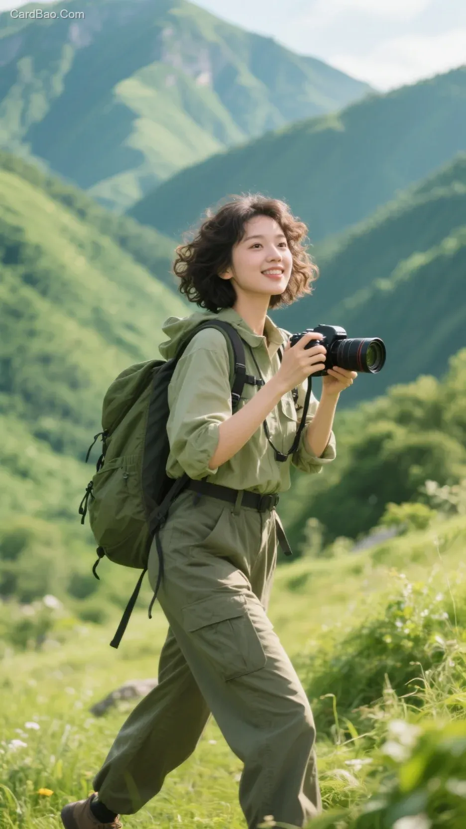 A young and beautiful woman, equipped with high-end outdoor travel gear, holding a camera, walking through the mountain wilderness with short curly hair.