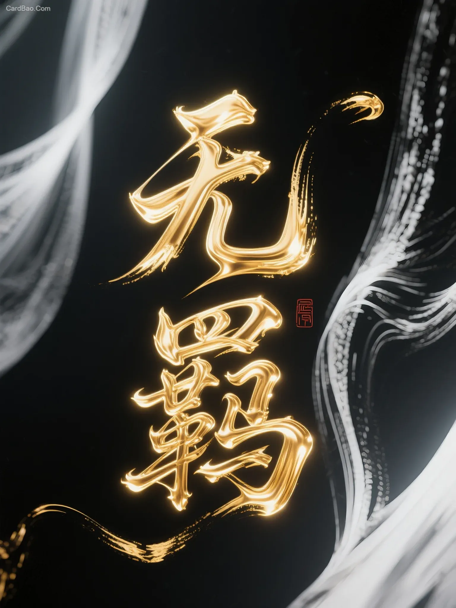 手写书法字“无羁”,字体狂野奔放,笔画飘逸,富有动感张力,飞白,国风,中国书法,笔触流畅,黑底白字。字体金色流体发光效果,笔画巧妙延长设计变形,电影空间感背景