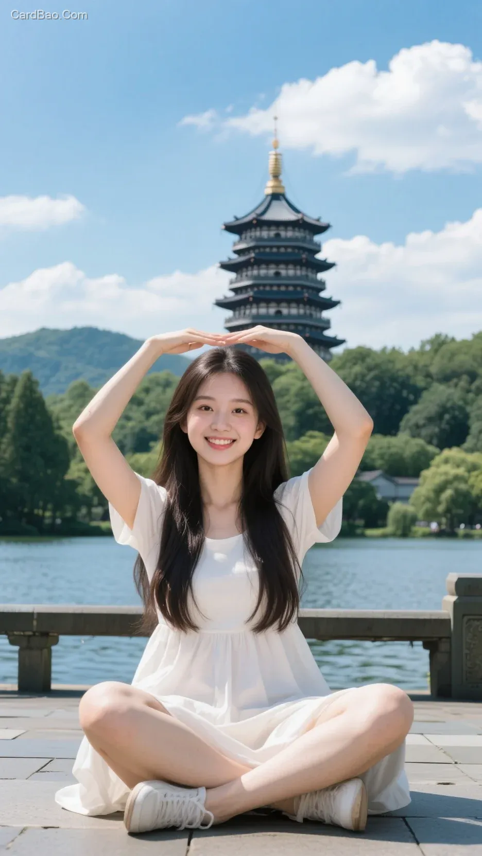 蓝天白云,西湖雷峰塔,一位漂亮女生,长发,眼含笑意,大眼睛双眼皮,大方得体,端庄。坐在地上,双手在侧面举着塔的动作。与雷峰塔合影。高清画质