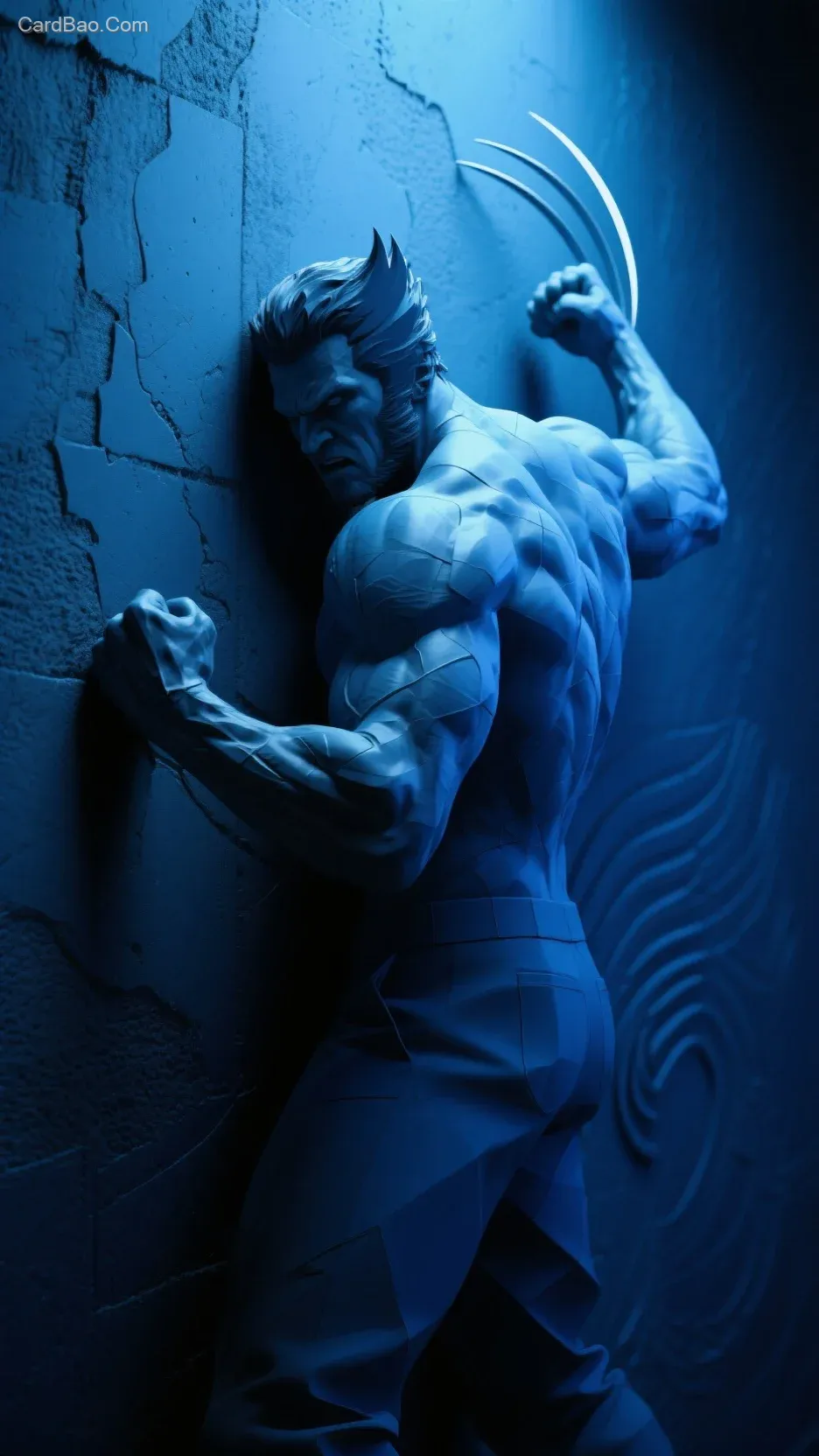 A dark wall, varying shades of cobalt blue, different color gradations, based on the relief carvings on the wall, ambiguous lighting, an unknown creative deep smudge, an astonishing concept, a raised impression, super imagination, an exploration of existential aesthetics, C4D representation, the beauty of structural mechanics, a character image, a Wolverine-like muscular man, in a state of intense fury, a turning-back posture, a turning-around striking pose, muscles bulging on the arms, a robust physique, an expression of retaliation, creativity, the contrast of an abstract world, stunning expressiveness, visual impact, a masterpiece by a folk artist.