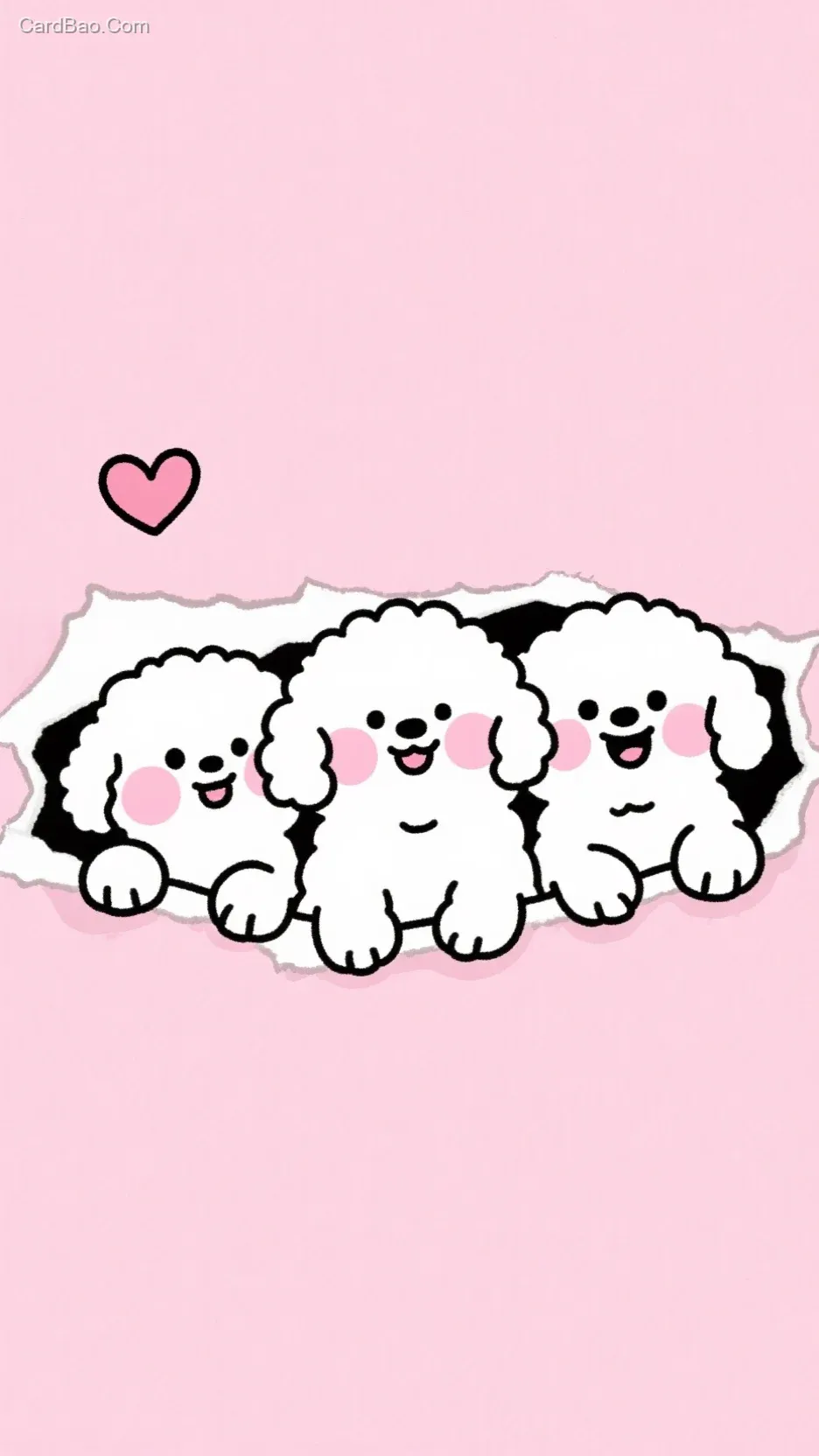 Q版漫画风格的小狗幼崽,用可爱风格的简单线条,在粉红色和白色的纸背景上,在图画的左上角有一颗小心。三只胖胖的小狗比熊幼崽从撕纸边缘后面探出头来,露出它的头和爪子。眼睛上有黑点的瞳孔,脸上带着微笑。上面是两只粉红色的脸颊,显得可爱极了,三只表情各不同