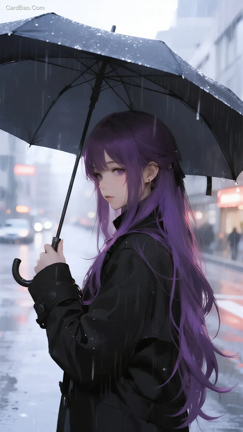 紫色长发女生打着一把伞在雨中漫步