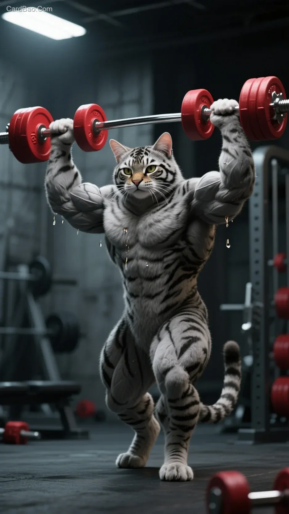 肌肉发达的灰色虎斑猫正在健身房进行举重训练,高清晰度,细节丰富的毛发质感,哑铃上挂着红色负重片,猫流着汗水眼神坚毅,电影级打光突显肌肉线条,深灰色工业风健身房背景,3D渲染超现实风格,景深效果突出主体,动态捕捉动作张力