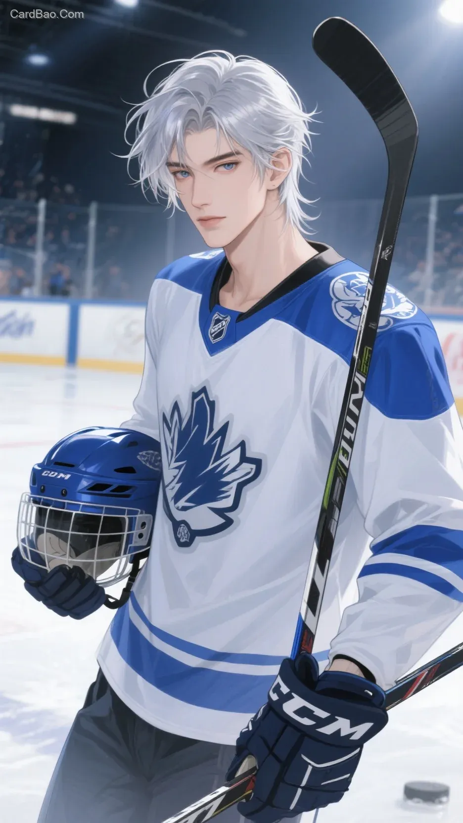 成男,五官立体俊美,精致,长睫毛,浅色瞳孔,眼眸深邃,下颌线清晰,高鼻梁,薄唇,银白色遮眼中长发(造型感,发丝凌乱分明),蓝白冰球服