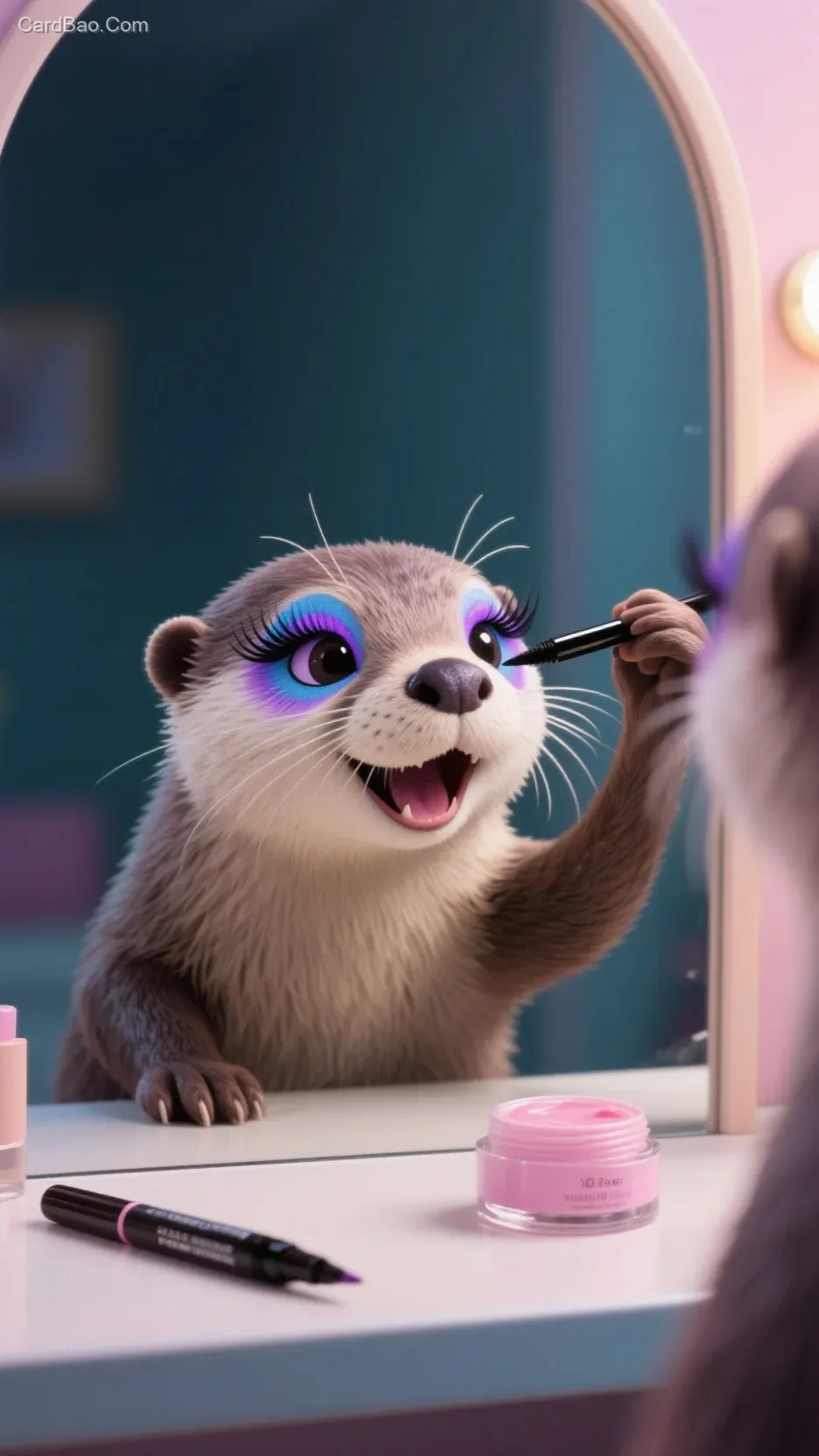 An otter is facing a mirror, holding an eyeliner pencil to apply eye makeup. The eye makeup features a dreamy blue-purple color, paired with thick, curled eyelashes. Its mouth is open, showing a happy expression. On the table, there is an eyeliner pencil and a small jar containing a pink cream. The overall color palette of the scene is soft, creating a cute and fun makeup atmosphere.