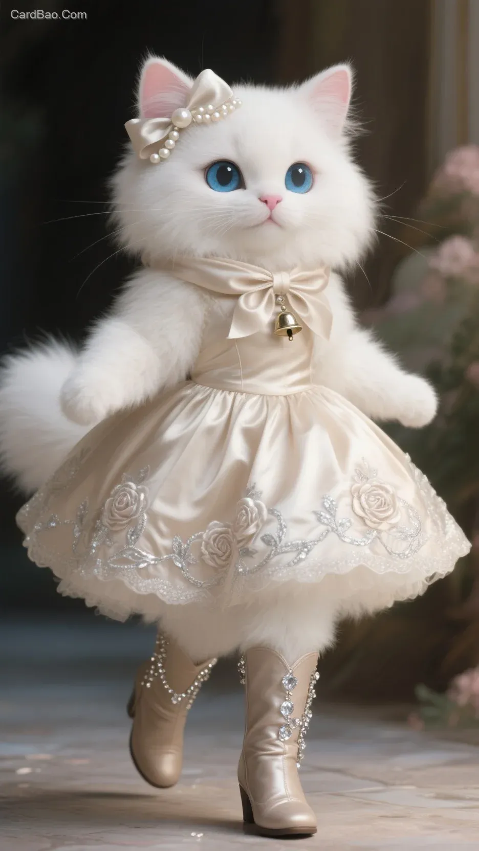 It wears a champagne-colored satin puffy dress that hugs its petite figure, with the skirt embroidered with faint silver-thread roses that sway gently with each movement. Paired with matching leather ankle boots adorned with crystal chains on the shafts, which reflect scattered glimmers of light as it moves. A silk scarf is draped around its neck, tied at the end with a small bell, exuding a sweet and enchanting aura with every gesture.