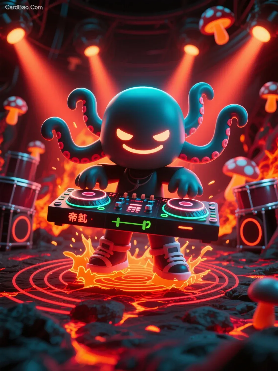 Q版原画设计,Q版原画角色设计,山海经角色设计,3D效果,豪华细节设计,高清,高品质,精细,站立, 帝江·夜店DJ形象:六爪打碟,无脸头部投射霓虹表情包背景:熔岩舞池+发光蘑菇音响特效:节奏光束随鼓点炸裂,踩踏地面泛起音波圈,有颜色,重颜色,色彩艳丽。