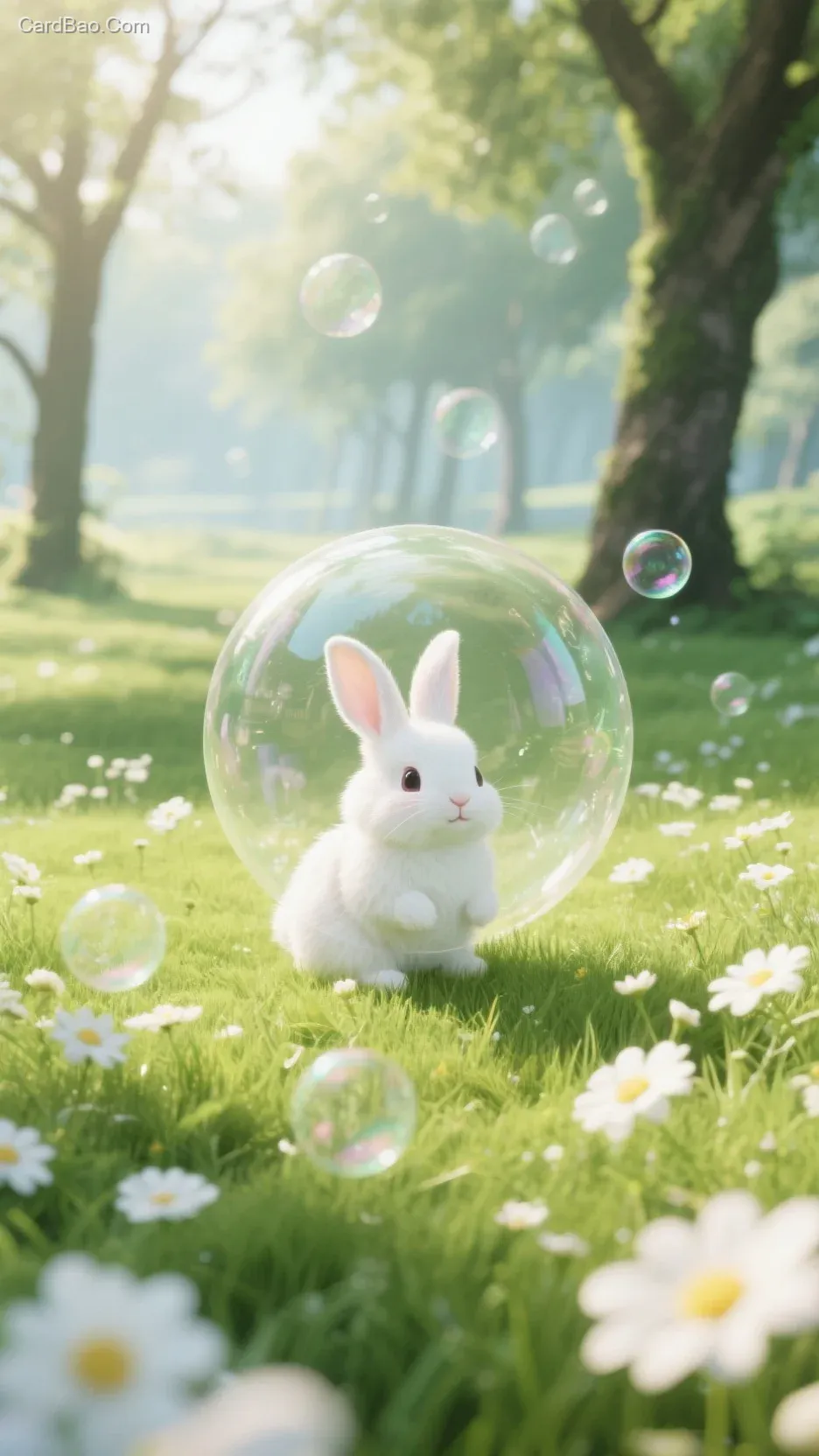 阳光明媚的草地,白色花朵,透明泡泡,可爱的白兔,周围有树木,光线柔和,营造出奇幻、美好的氛围。