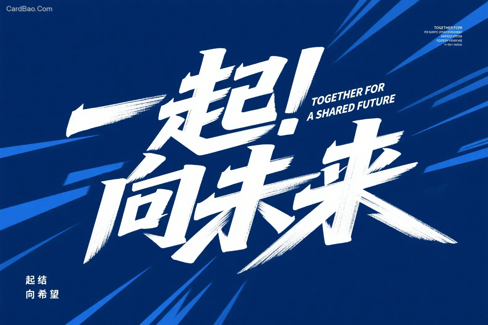 生成一款具有强烈视觉冲击力的艺术字体,主体文字为“一起向未来”,搭配英文“TOGETHER FOR A SHARED FUTURE”。字体采用粗体设计,笔画边缘带有锐利的切割感与速度线效果,营造出蓬勃向前的动感。整体色调为纯净的白色字体,搭配深邃的蓝色背景,形成鲜明对比。添加细腻的光影效果,增强字体的立体感与层次感,展现出现代、简洁且充满力量的设计风格,从各个角度看都能传递出积极向上、携手共进的未来感。