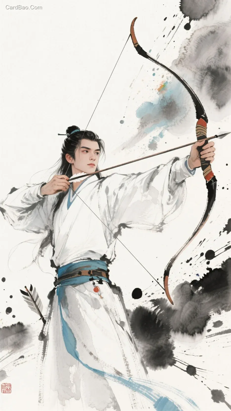 Illusory texture, blurred diffusion, contrasting color accents, maximalism, narrative sense, scene atmosphere, matte texture, freehand style, bold yet delicate brushstrokes, masterful freehand composition, extensive use of negative space, image collage, emphasis on artistic conception, watercolor blending, splashed ink effect, color diffusion, strong tonal contrast. Theme: A handsome man in white ancient attire bending a bow to shoot an arrow.