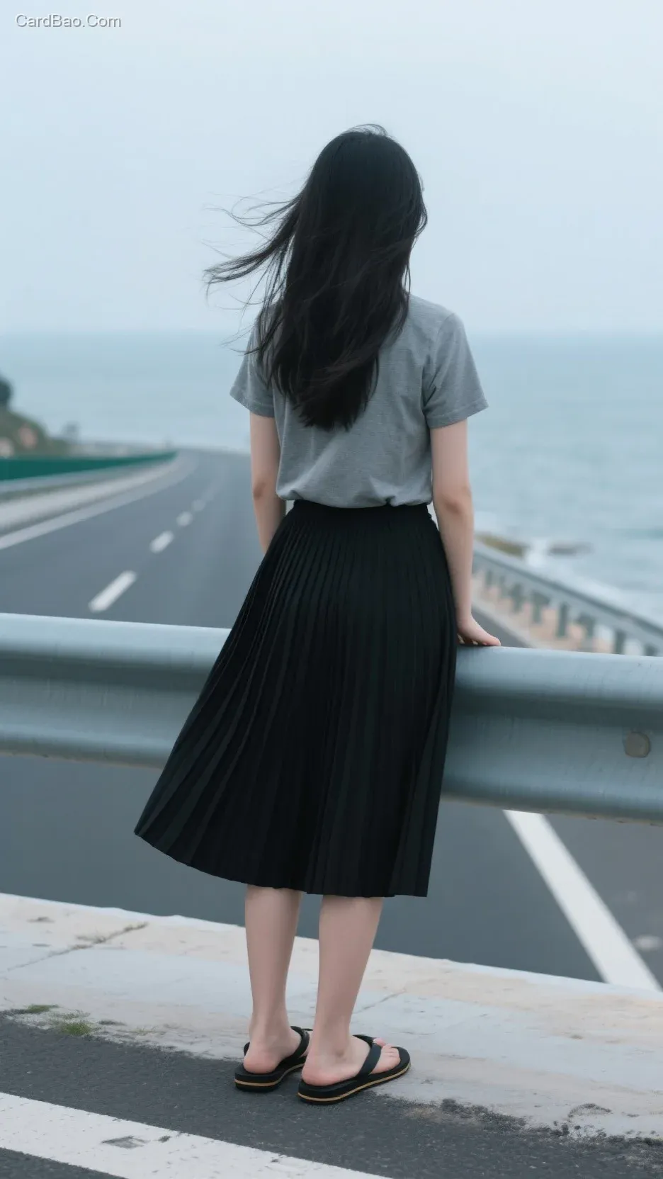 A real-style photograph of a long-haired girl standing on a seaside highway, shot from behind with her back to the camera, her face not visible. Her hair is flowing in the wind, and she is wearing a black pleated maxi skirt, a gray T-shirt, and black flip-flops. The image exudes a sense of allure, with a cool color palette, film-like texture, and an emotional atmosphere. She is leaning against the railing.