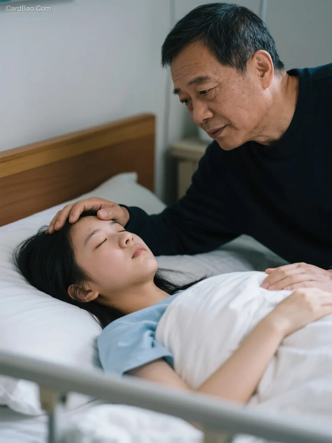 An 18-year-old girl is lying sick in bed, and her father is gently stroking her forehead.