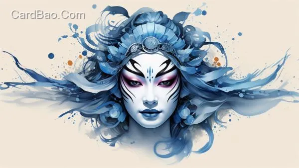 0.03毫米丝绸绘制的川剧脸谱,三维多层结构解构图,层叠透视效果,科技蓝色调,超高清画质。